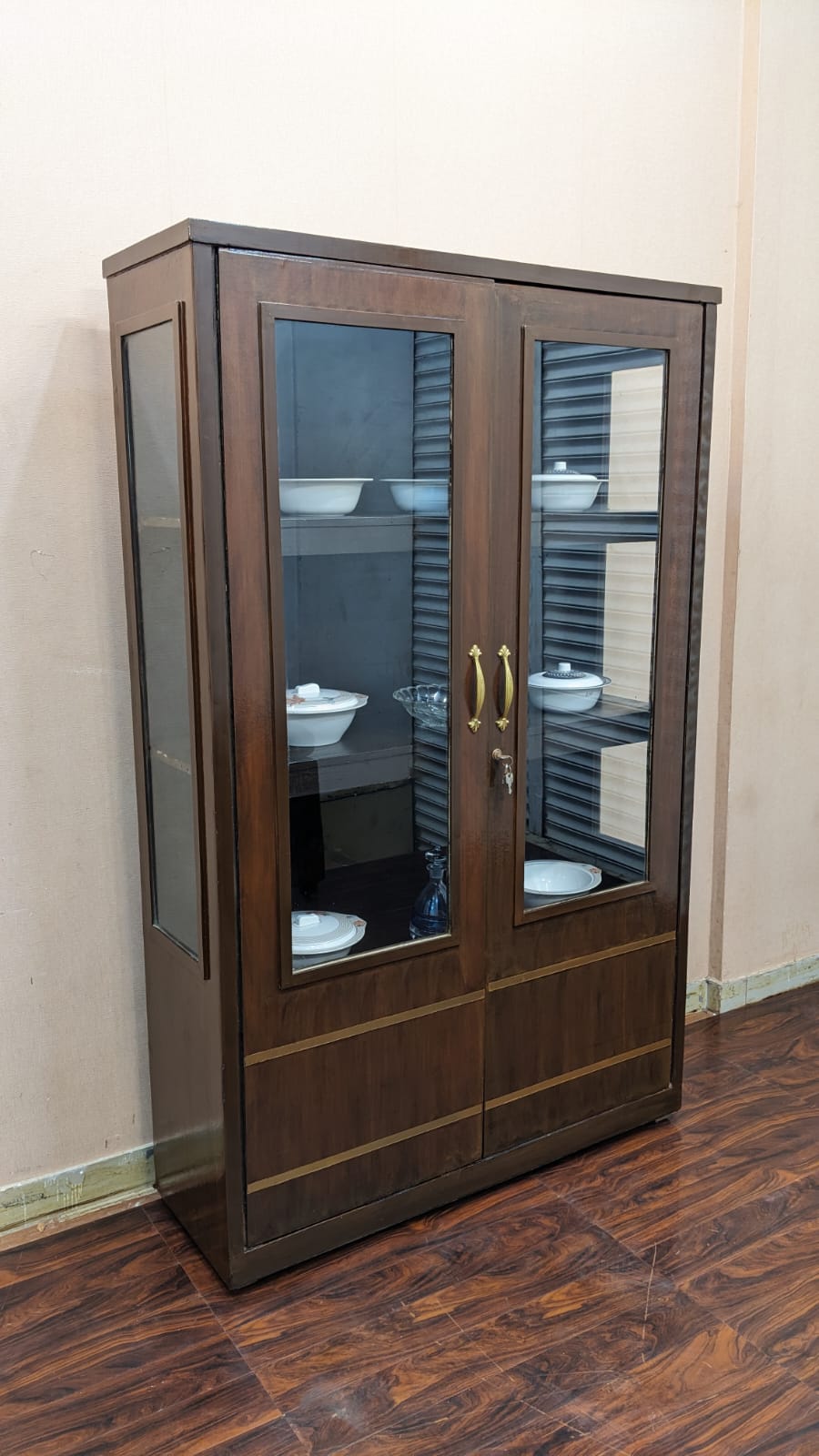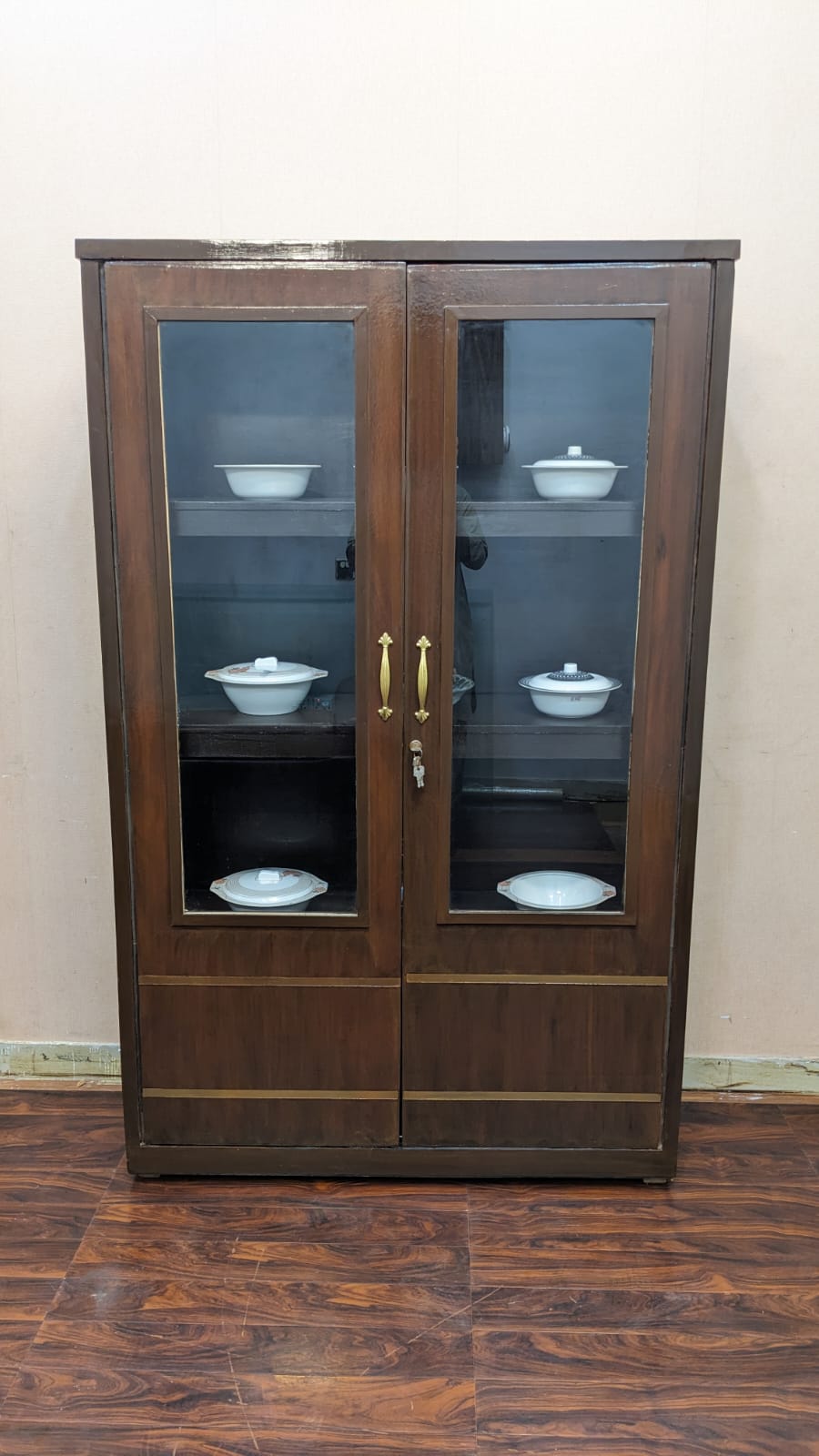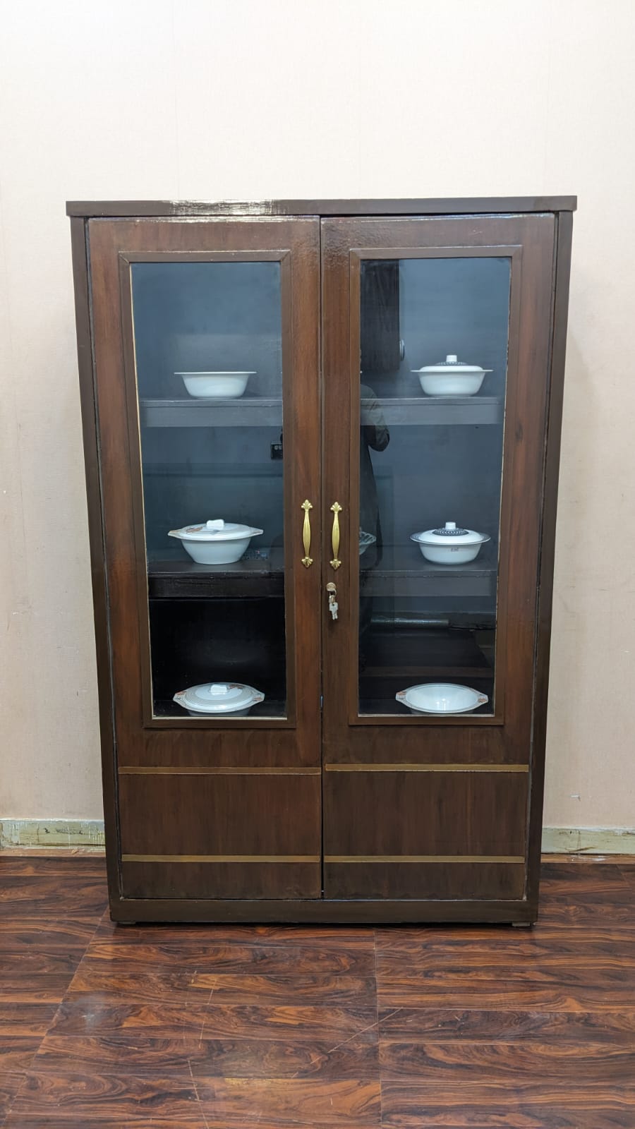 Upgrade your dining or living space with this elegant crockery divider, perfect for showcasing your dishes, décor, or collectibles. Featuring glass-front double doors with sturdy brass handles, it offers both style and storage in one timeless piece.