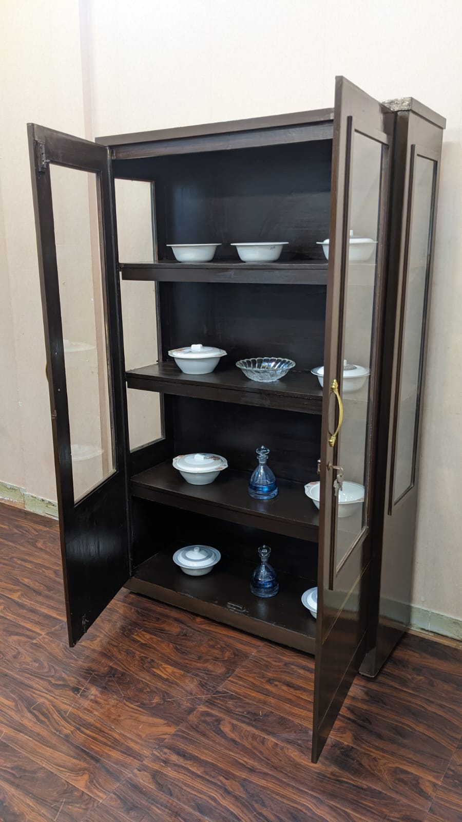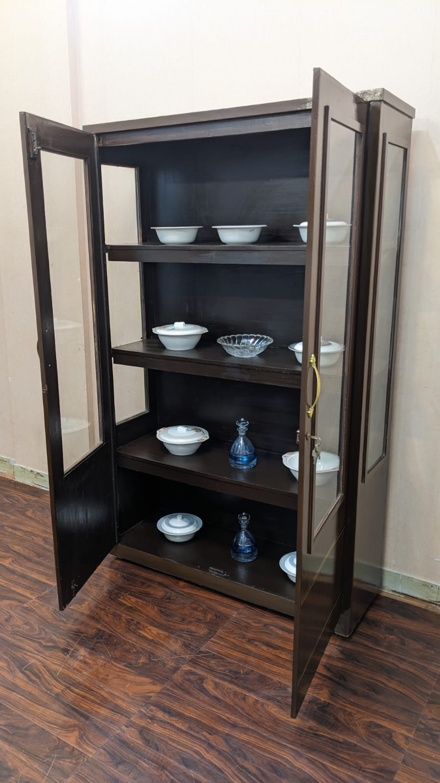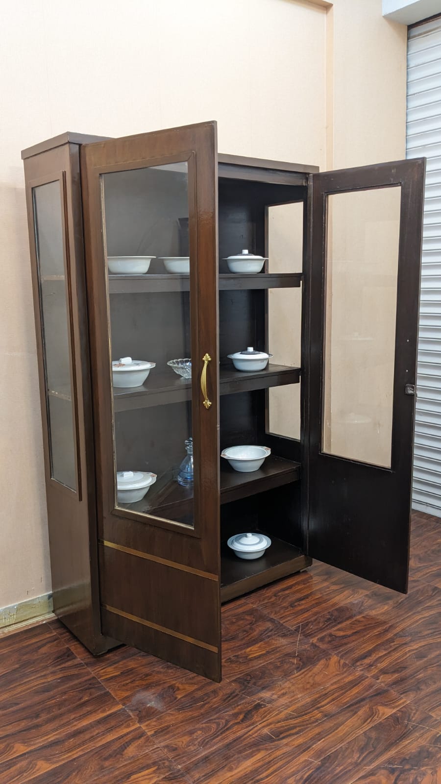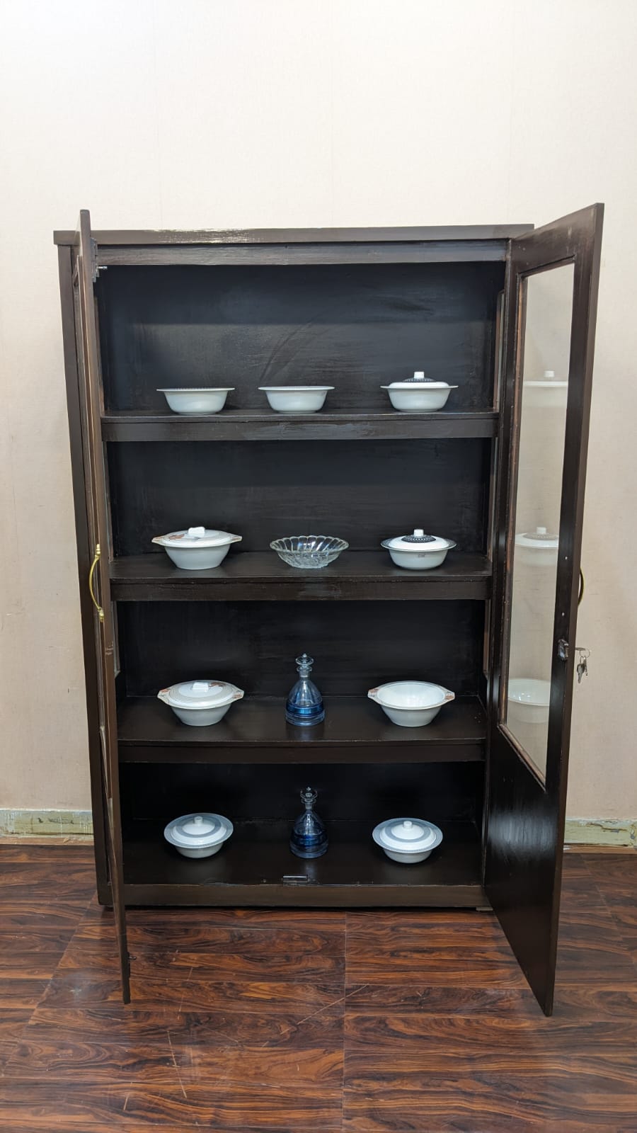 Upgrade your dining or living space with this elegant crockery divider, perfect for showcasing your dishes, décor, or collectibles. Featuring glass-front double doors with sturdy brass handles, it offers both style and storage in one timeless piece.