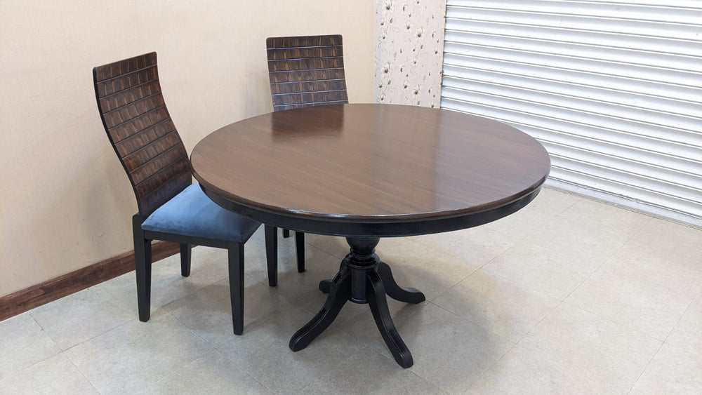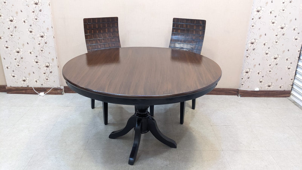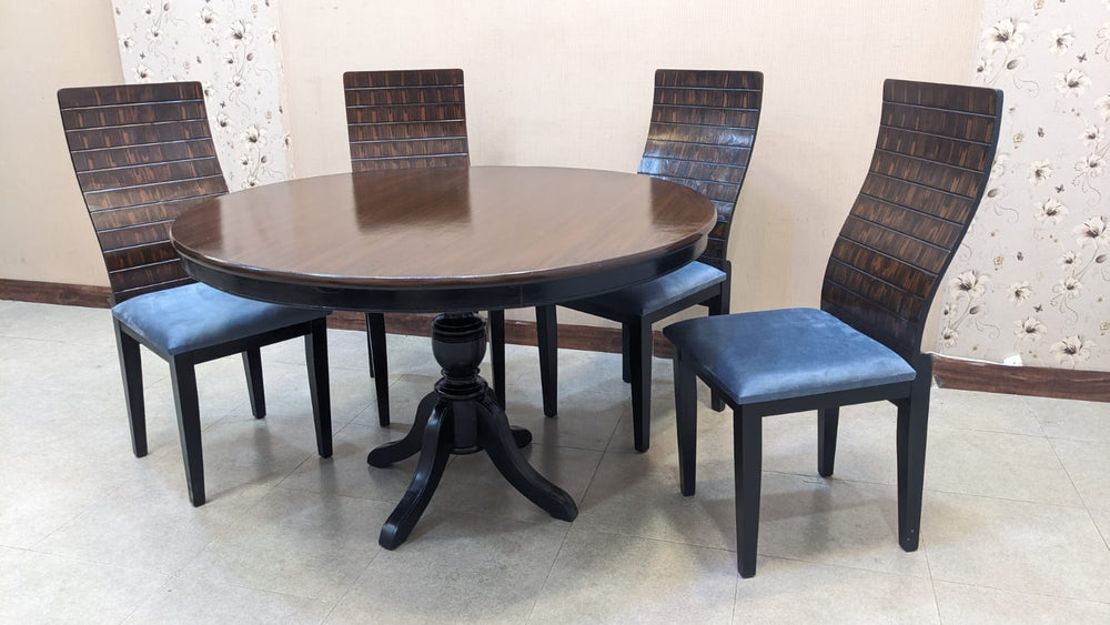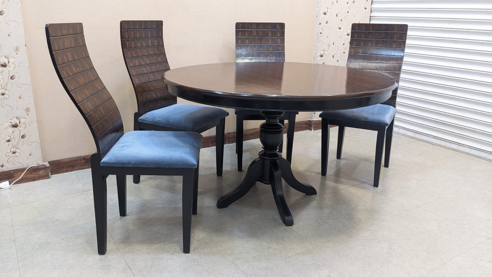 Designed with a rich wooden finish and a classic round tabletop, this set creates the perfect setting for family dinners and gatherings.