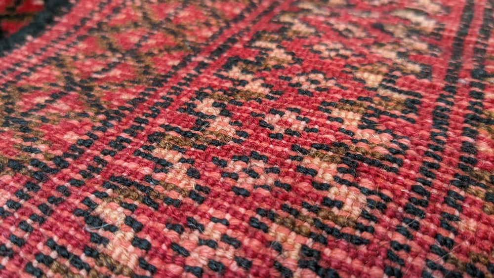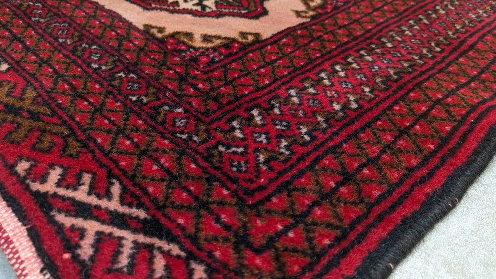 Bring home the charm of true craftsmanship with this authentic hand-knotted Persian Turkmen rug, known for its rich red palette, tribal motifs, and intricate geometric patterns.