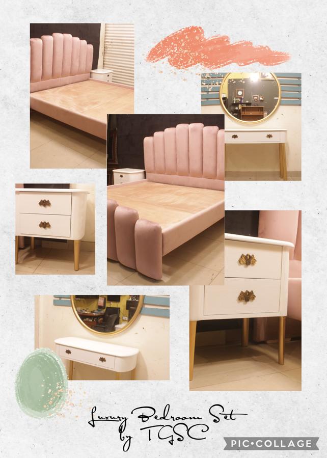 Tgsc Brand New Design - Exquisitely crafted fully cushioned King Size Bed With Absolutely Captivating Side Tables and Dressing Table With Gorgeous Round Mirror. The is made in combination of pure Canadian oak wood and oak board and is finished in quality deco polish.