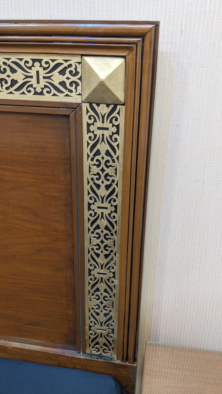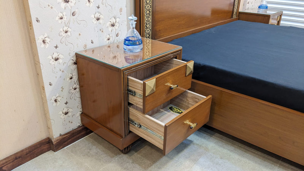 Upgrade your bedroom with this beautifully crafted King Size Bed Set, featuring timeless wooden aesthetics and tasteful gold carved detailing.