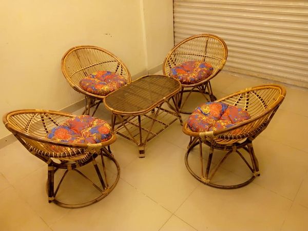 Tel: 03111100230 TGSC BRAND NEW DESIGN 4 PCS CANE CHAIRS AND A TABLE WITH CUSHIONS. 9,500@PIECE