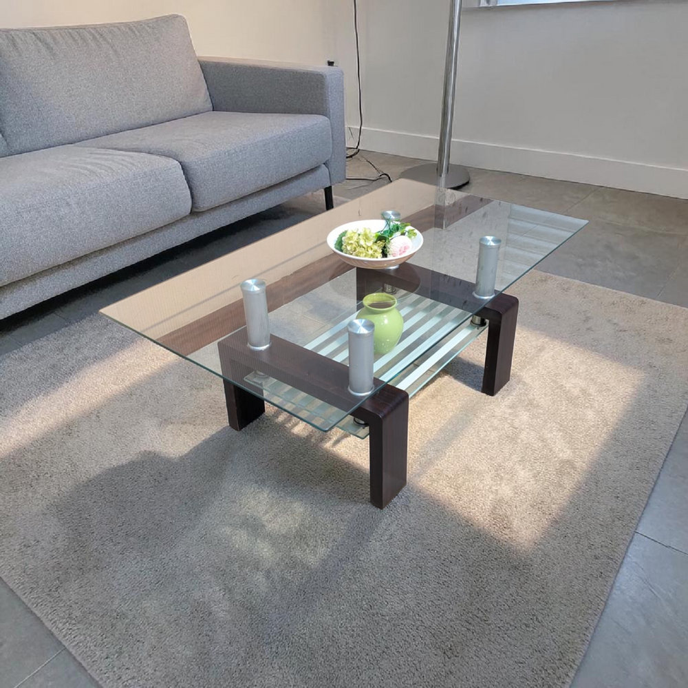 A sleek and contemporary center table featuring a clear glass top, stylish metal supports, and a sturdy lamination base — designed to add a modern touch to any living space.