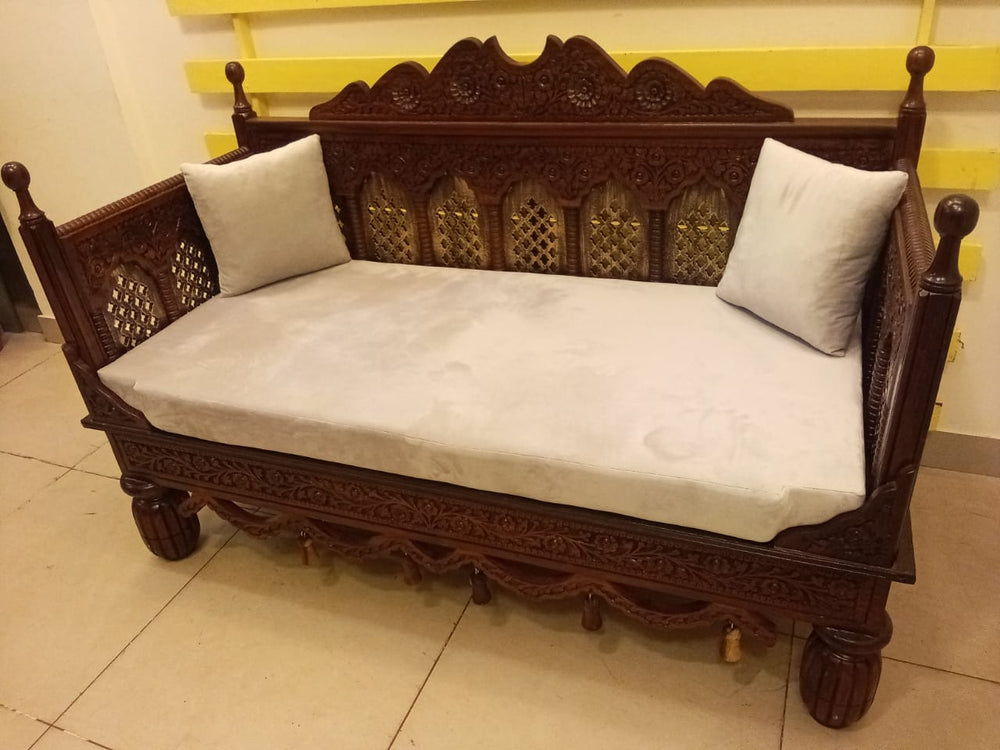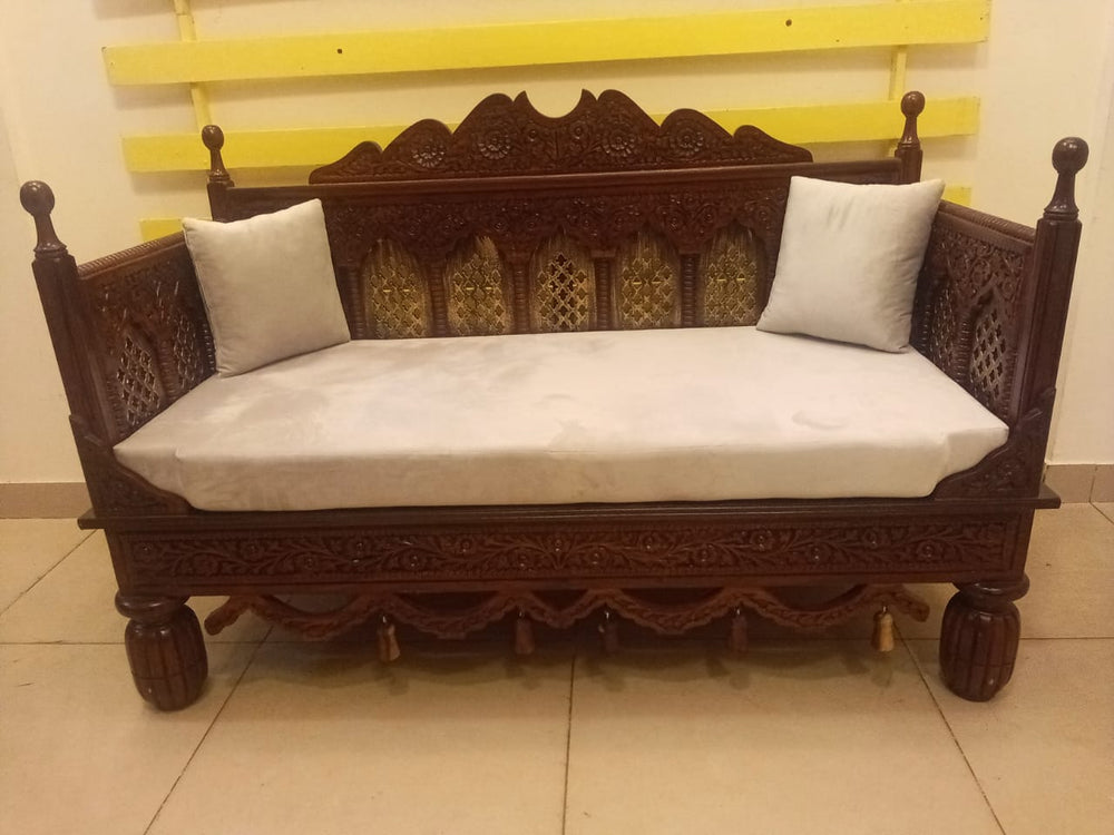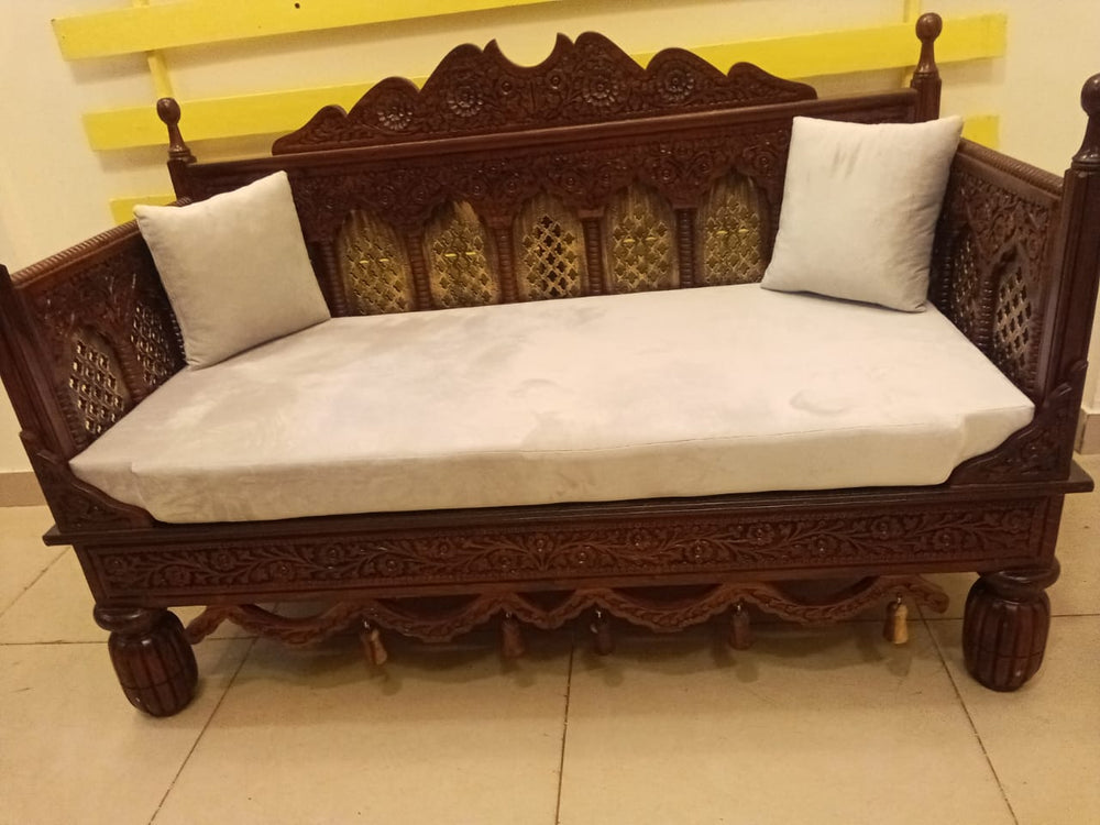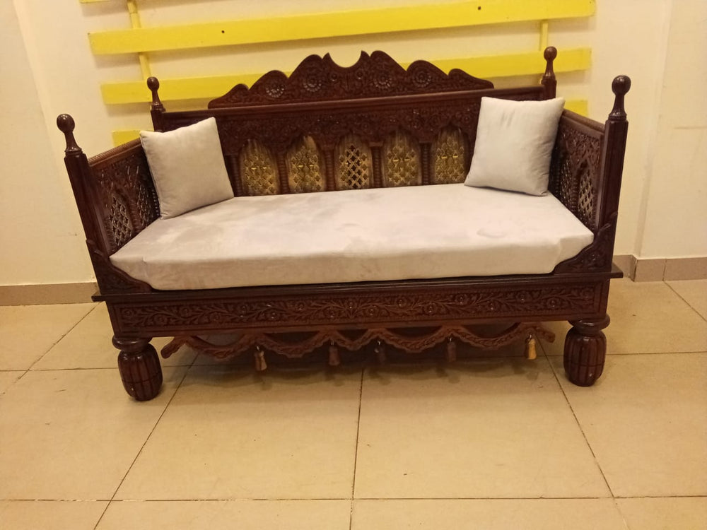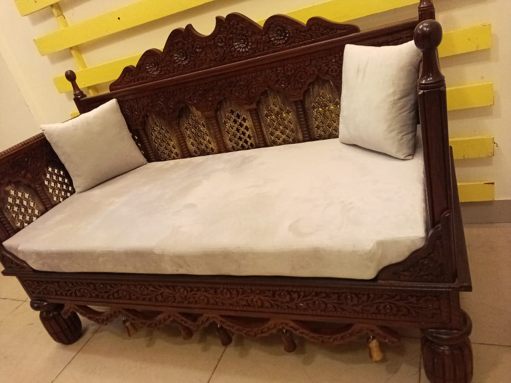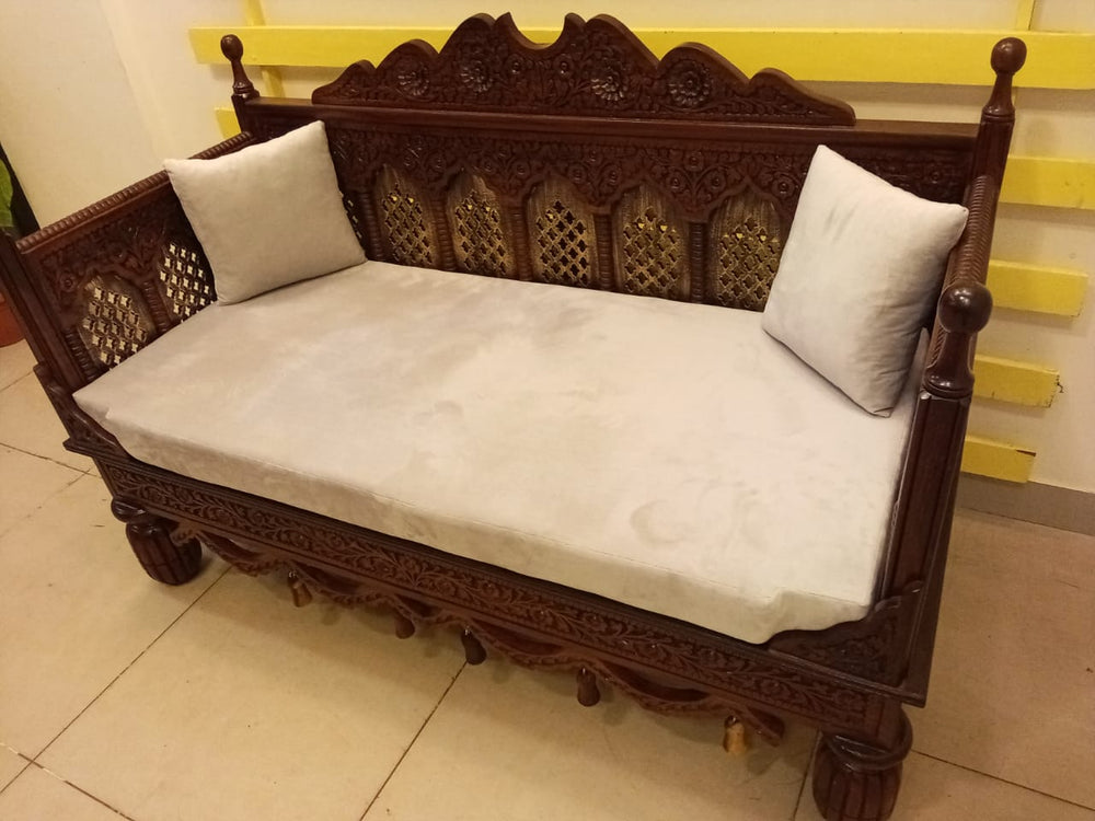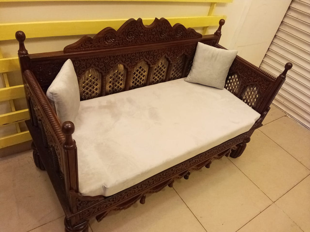 Tel: 03111100230 Absolutely Gorgeous Pure Sheesam Wood Chinioti 2 Seater Sofa With beautiful Carving done on it. The Fabric used is of Premium Quality