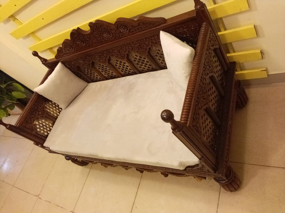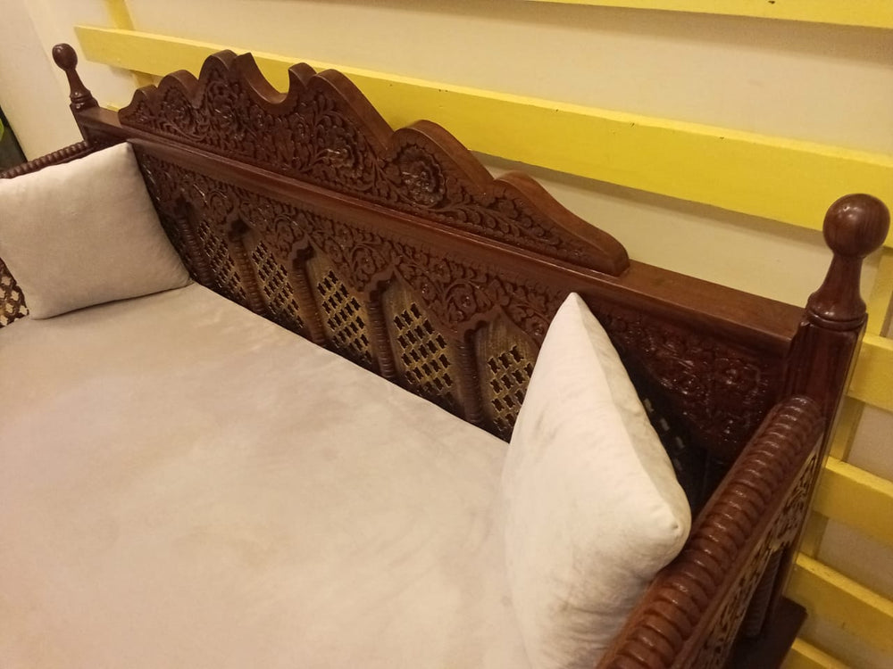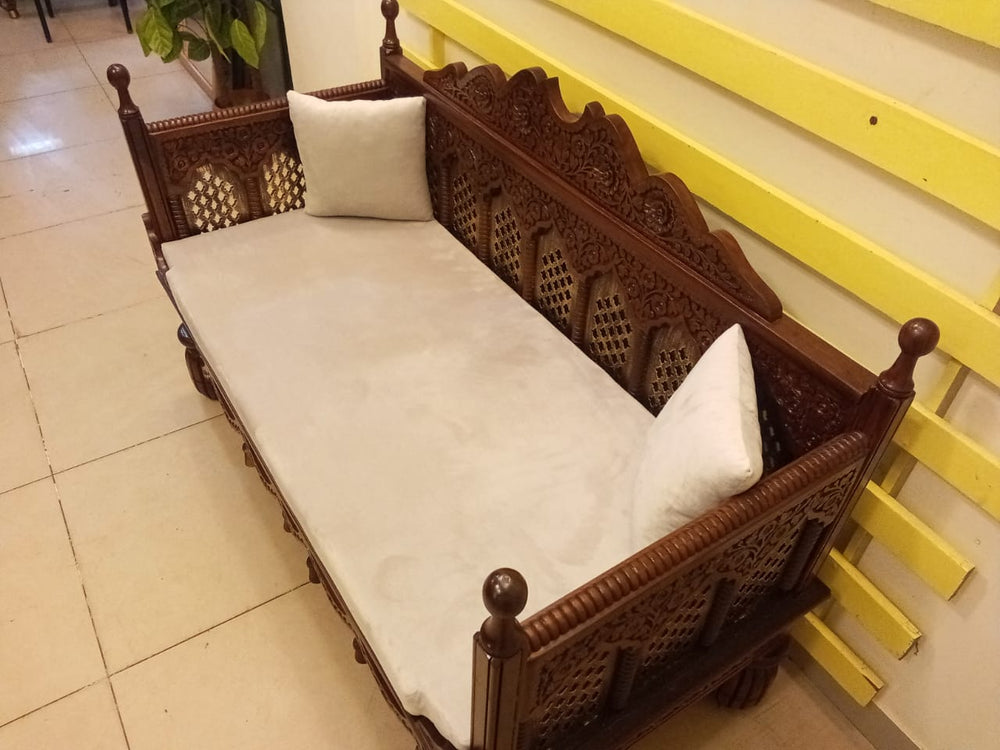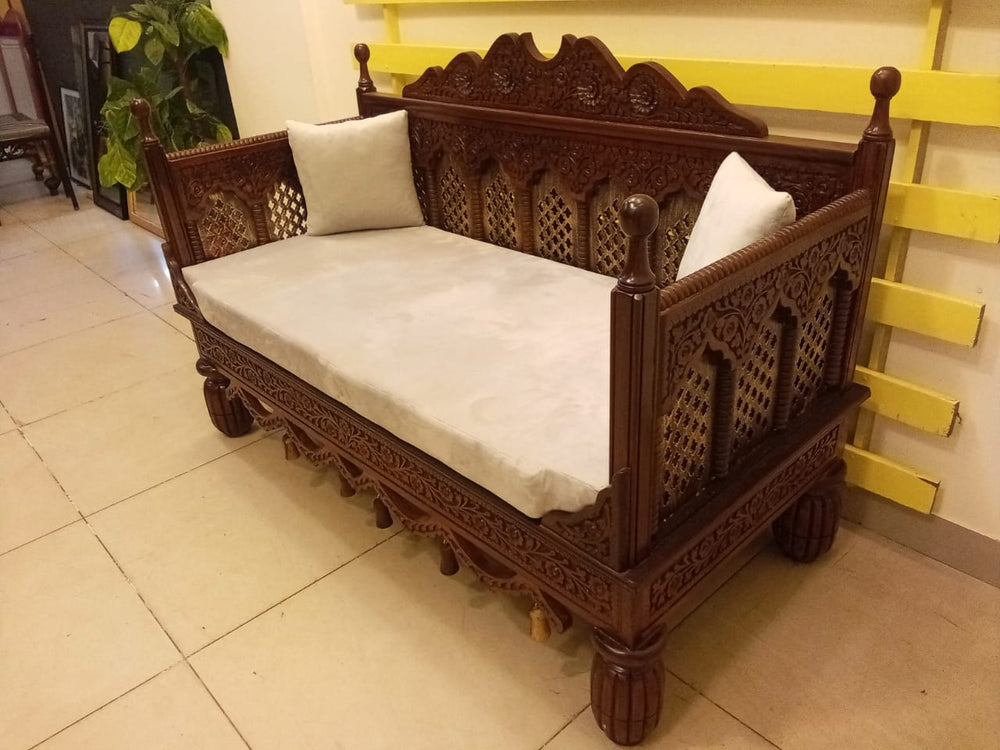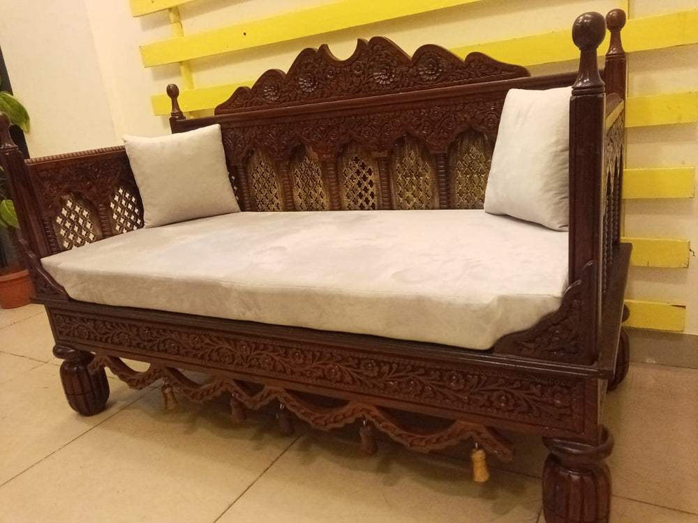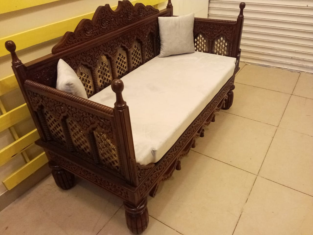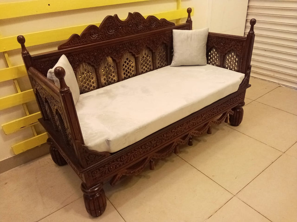 Tel: 03111100230 Absolutely Gorgeous Pure Sheesam Wood Chinioti 2 Seater Sofa With beautiful Carving done on it. The Fabric used is of Premium Quality