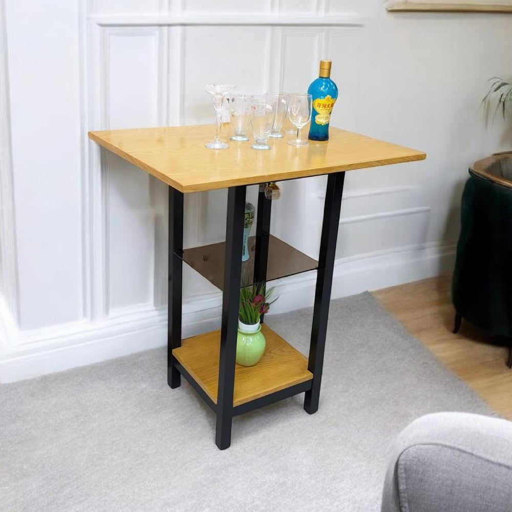 A stylish and practical serving station featuring a metal frame structure with a wooden top, built-in hanging glass holder, and a lower storage shelf for bottles or serving items.