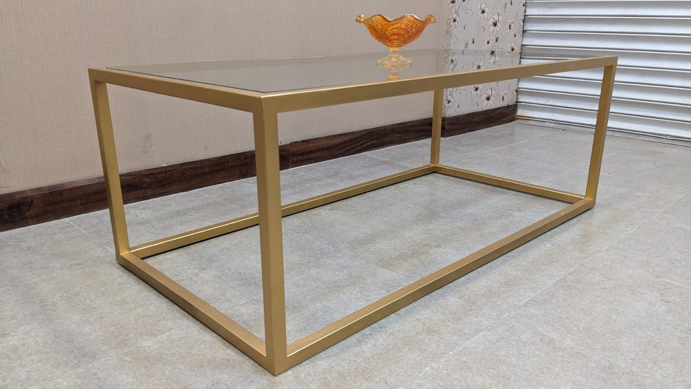 A sleek and stylish modern design coffee table featuring a sturdy metal frame in a refined gold finish and a clear glass top for a clean, contemporary look.