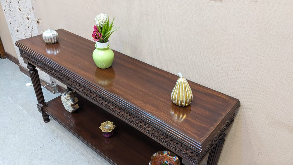Crafted in Sheesham Wood & Sheesham Ply, this elegant console features intricate hand carving work across the apron, giving it a rich, royal look. The turned legs and lower storage shelf add both strength and functionality.