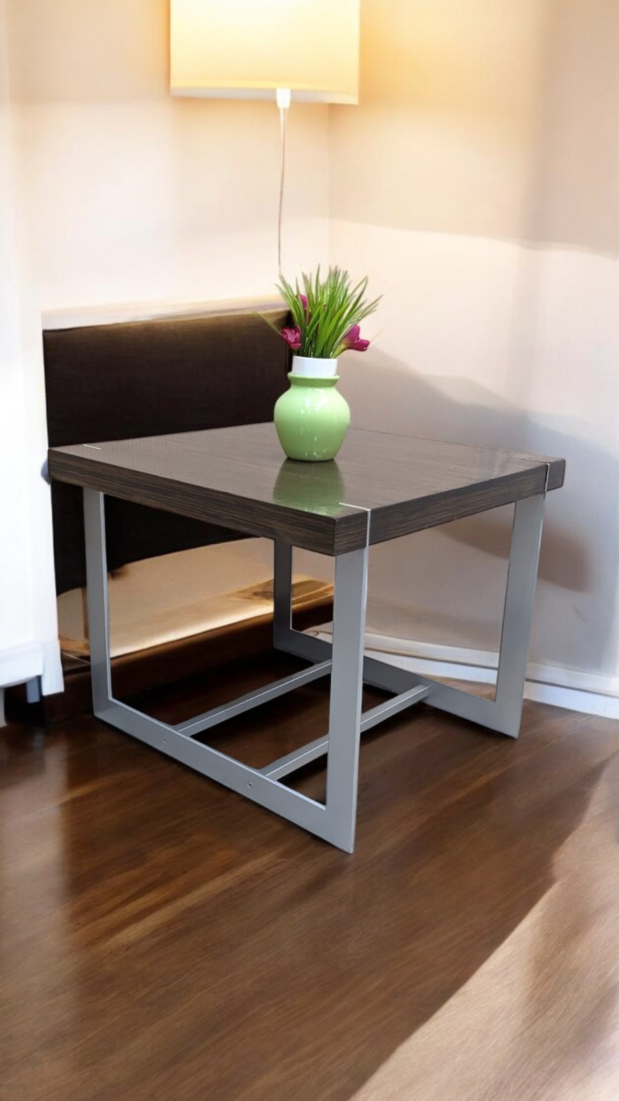 A sleek and modern corner table featuring a sturdy stainless steel base paired with a rich top finish. Its clean geometric design makes it perfect for contemporary homes, offering both style and functionality. Ideal for placing beside a sofa, in a room corner, or as a decorative side table.