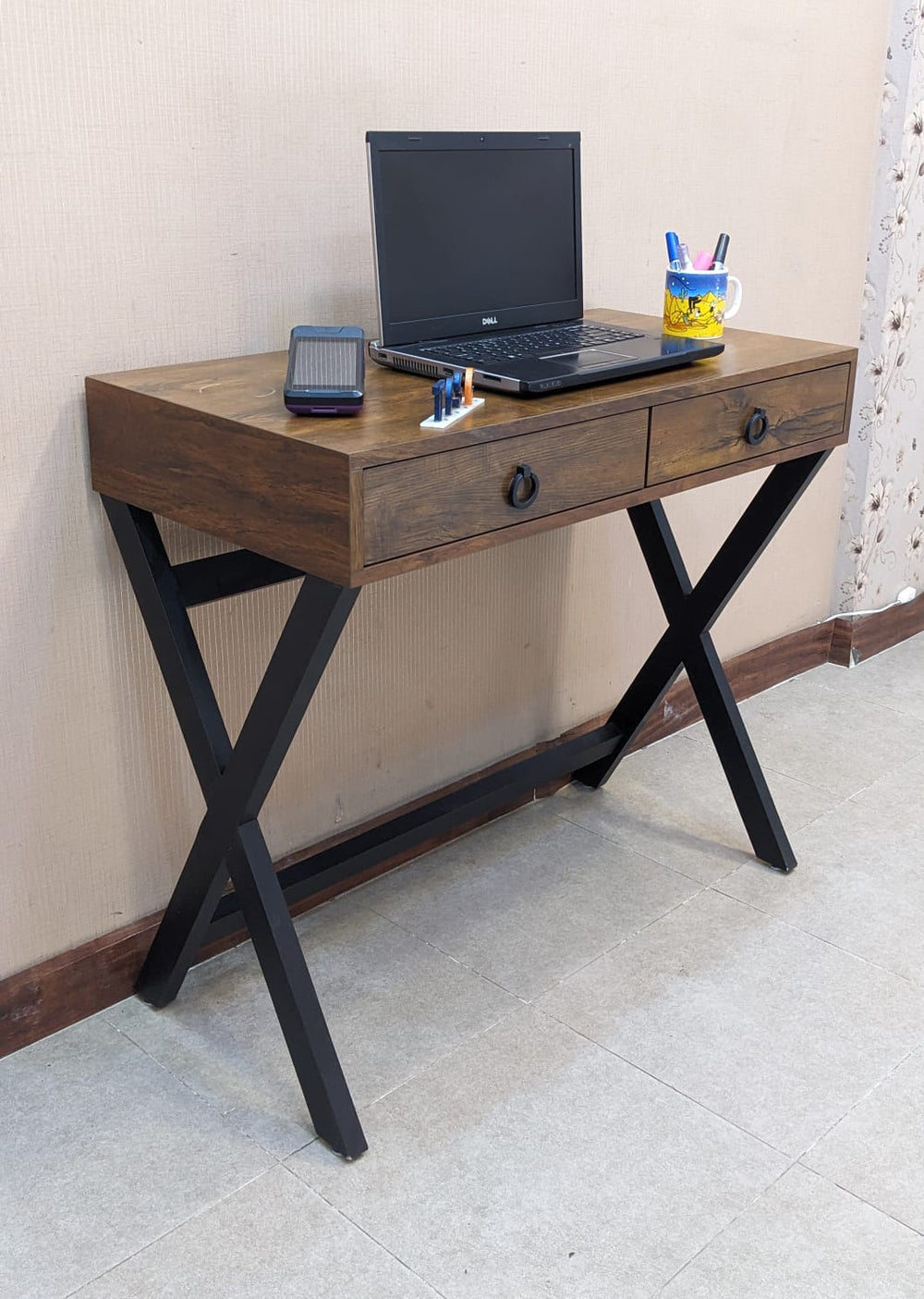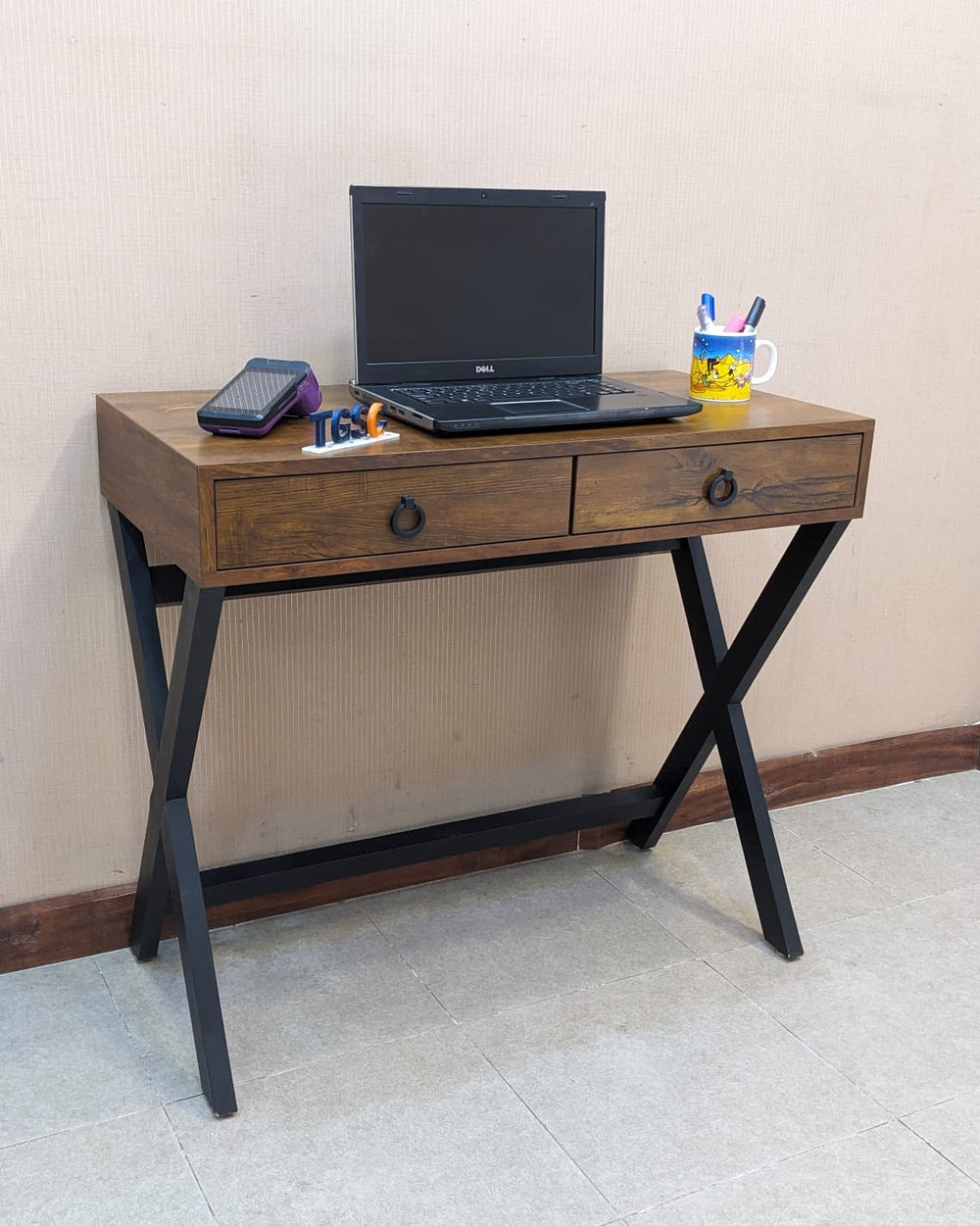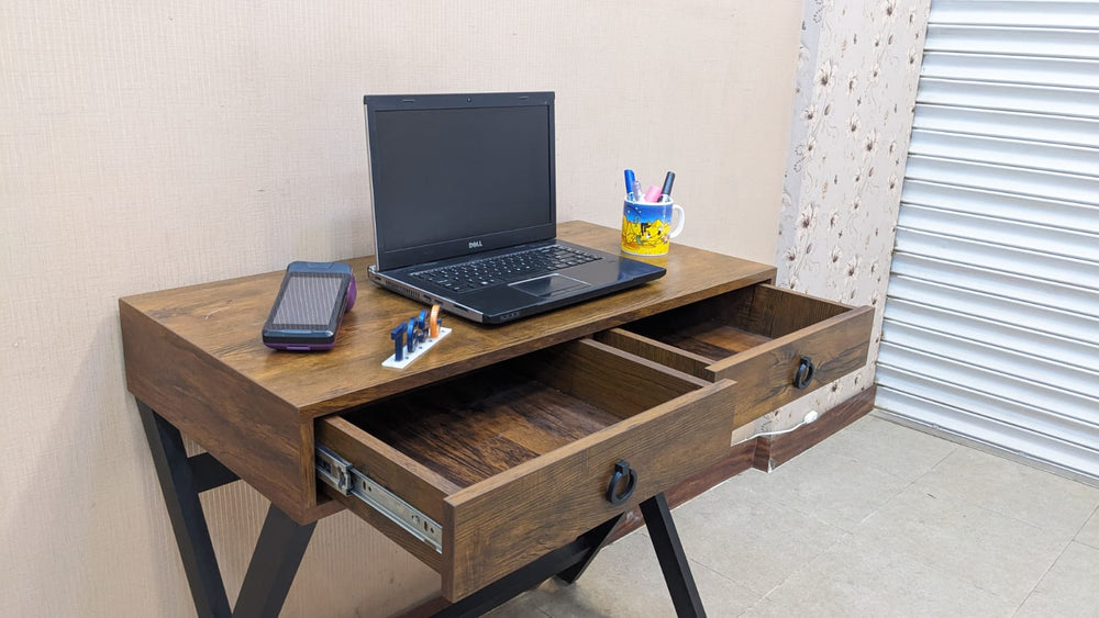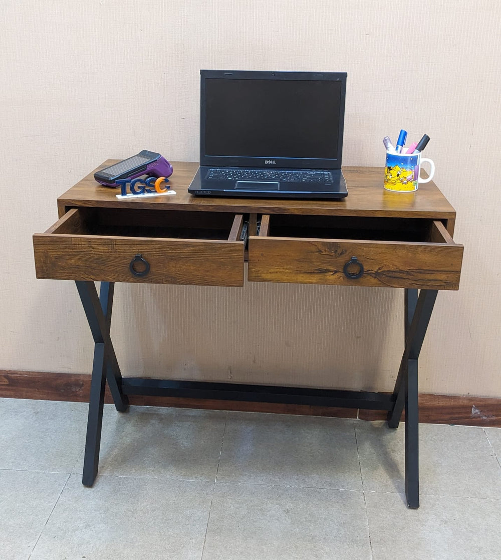 Sleek and stylish design featuring two smooth-sliding drawers for convenient storage. Crafted in durable lamination material with sturdy wooden X-legs for modern appeal.