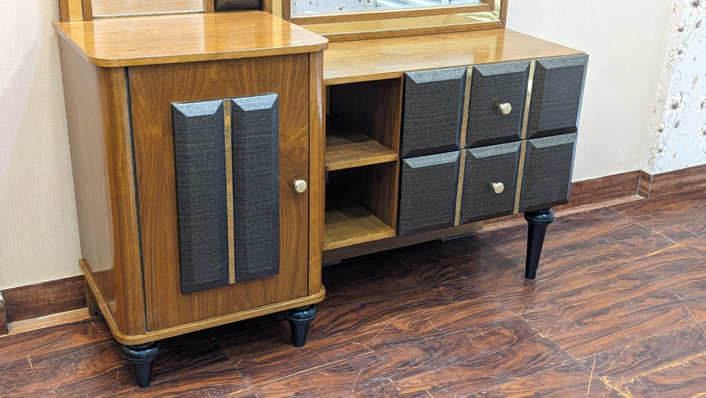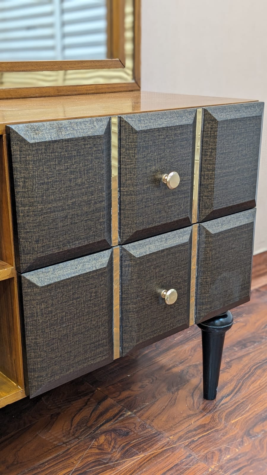 Upgrade your bedroom with this Stylish Dressing Table, crafted with a modern aesthetic and premium polish finish. Designed for both elegance and practicality, it features two large mirrors (one etched decorative), multiple drawers, and a side cabinet for convenient storage.