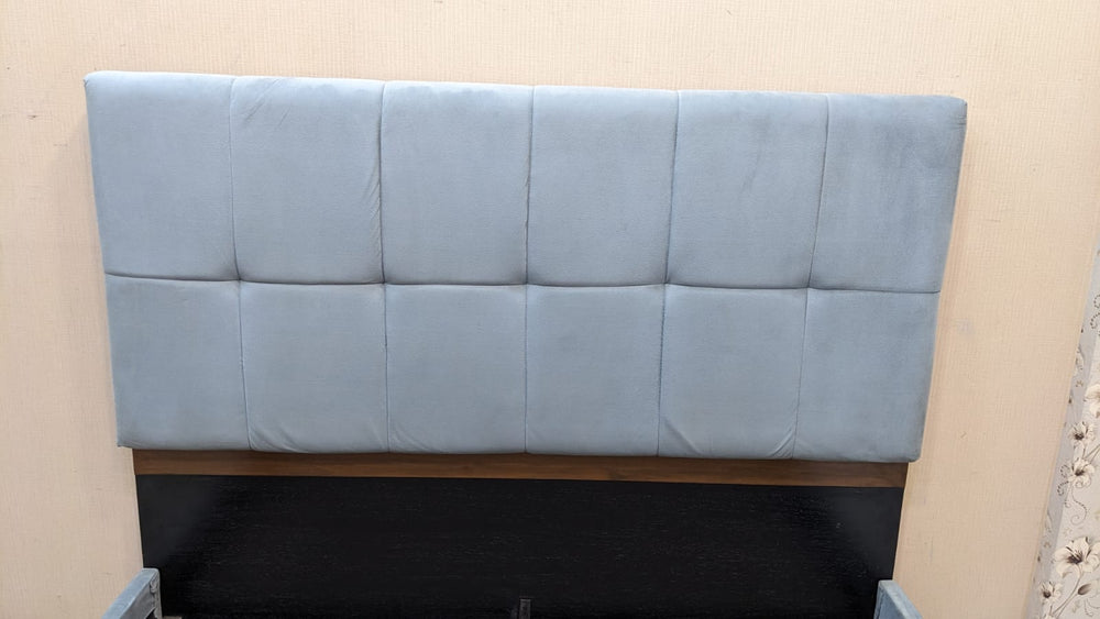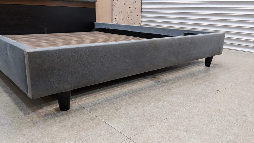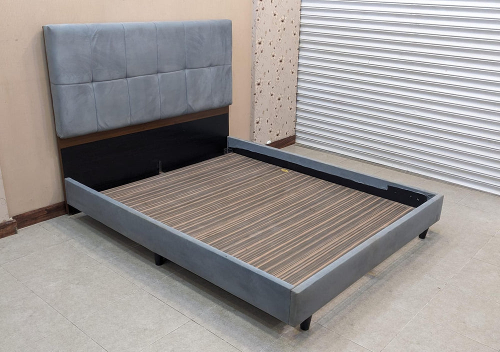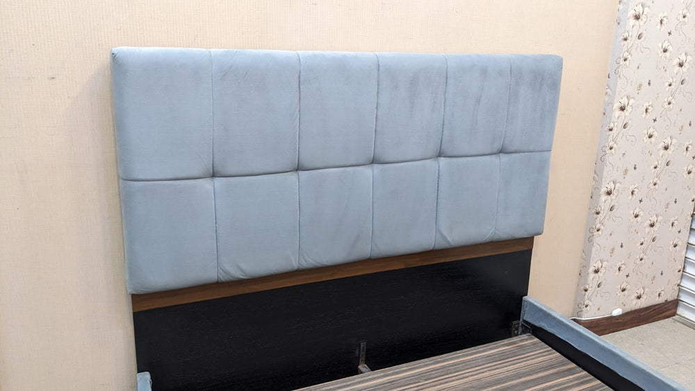 Bring home this elegant fully cushioned queen size bed, upholstered in soft velvet fabric for a premium and comfortable look. A modern design that fits beautifully in any bedroom.