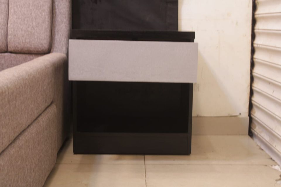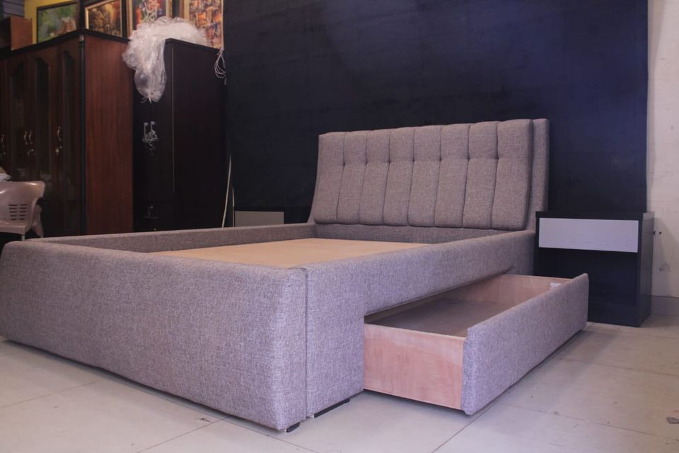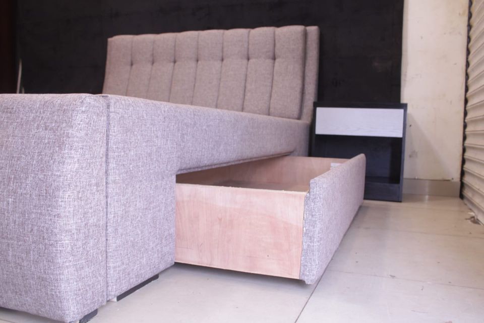 TGSC BRAND NEW DESIGN - FULLY UPHOLSTERED BED WITH BUILT IN STORAGE DRAWERS ALONG WITH 2 SIDE TABLES