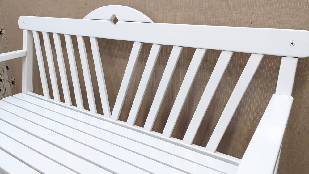 Bring a fresh, airy charm to your space with this beautiful imported 2.5 seater bench, crafted from pure solid wood and finished in a crisp white polish. Its clean slatted design and sturdy armrests make it a perfect blend of style and durability.
