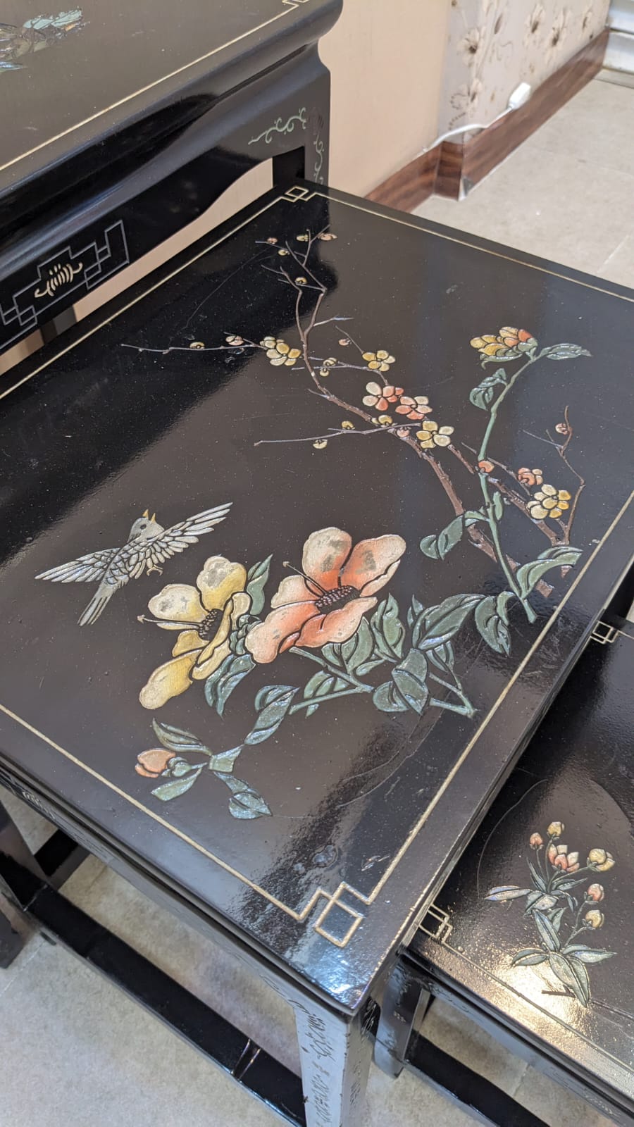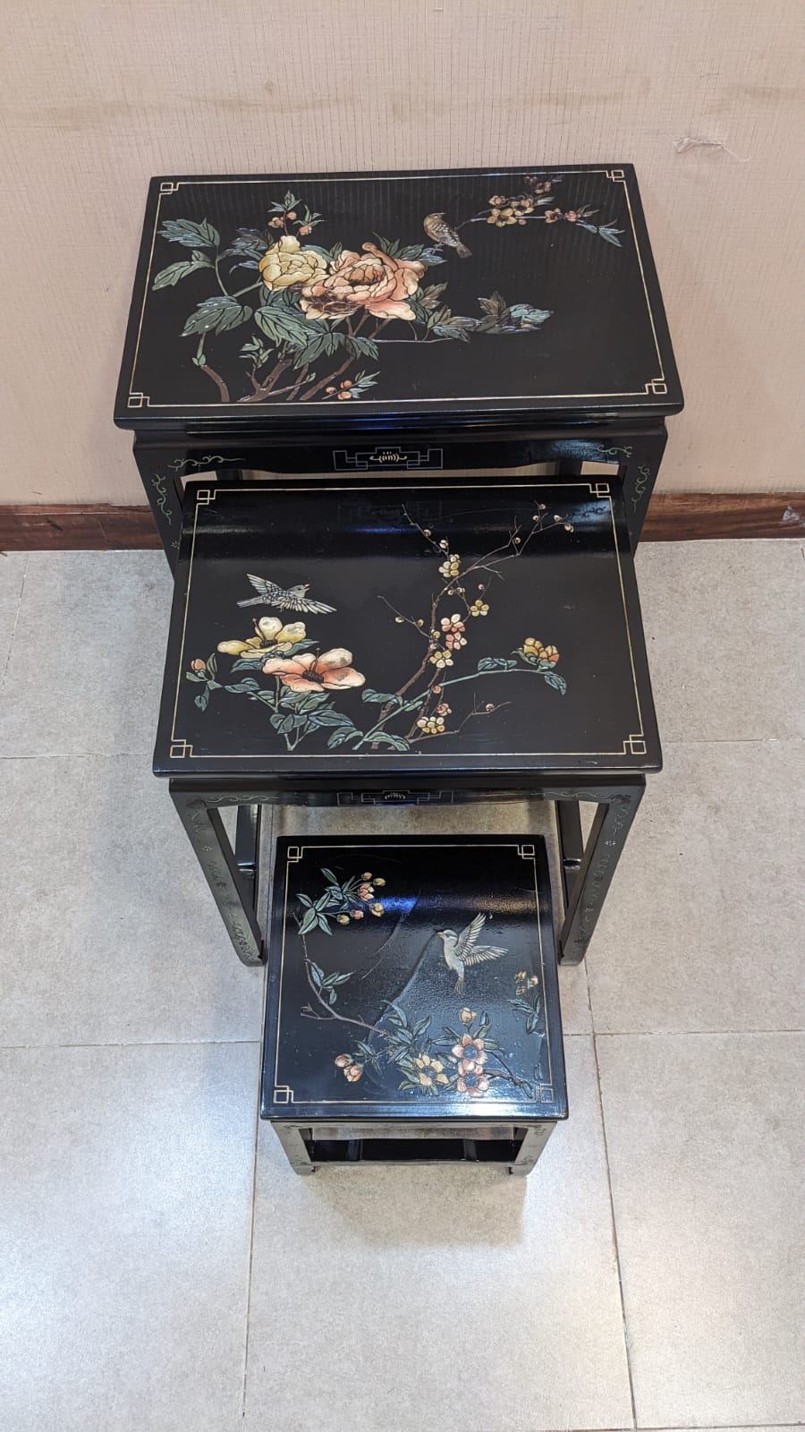 The glossy black surface paired with delicate hand-painted florals and birds gives this set a true antique luxury feel. Perfect as side tables, tea tables, or decorative accent pieces for your living room.