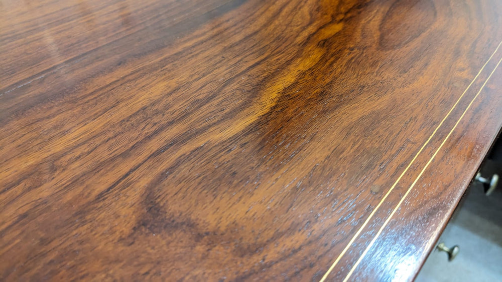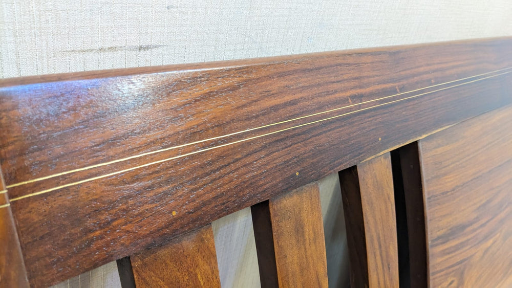 Featuring a sleek curved headboard and footboard, elegant lines, and intricate brass inlay detailing, this set offers timeless beauty and durability.