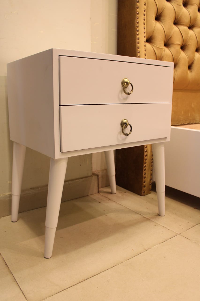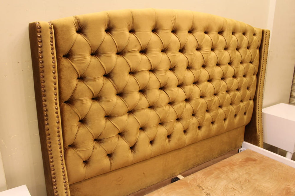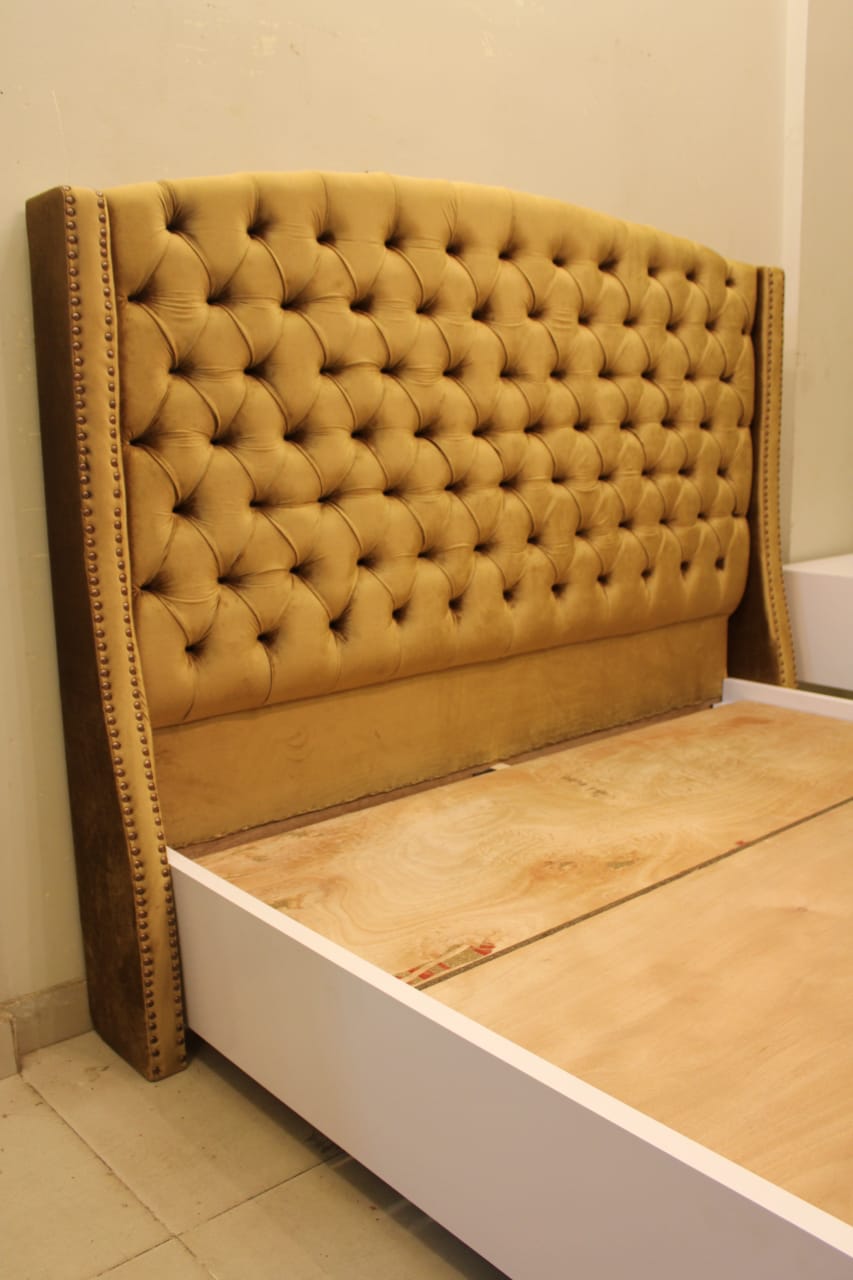 Absolutely gorgeous king size cushioned bed set in Chesterfield design. The set also includes beautiful dressing table and 2 side tables in white and gold combination. The finishing is done with premium quality Deco.