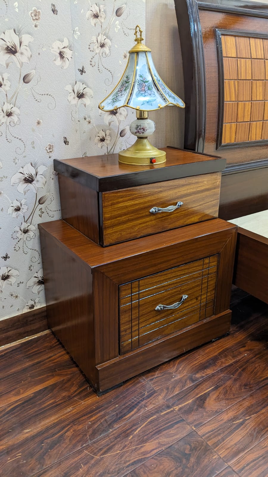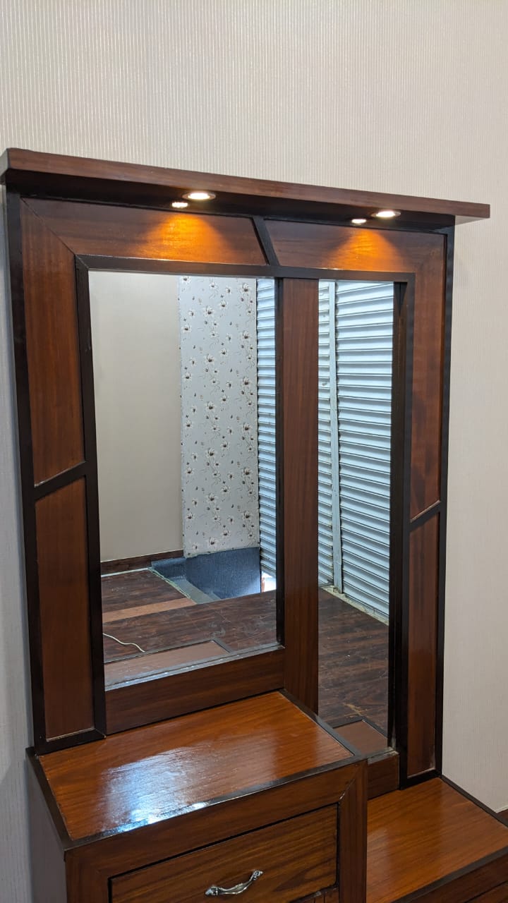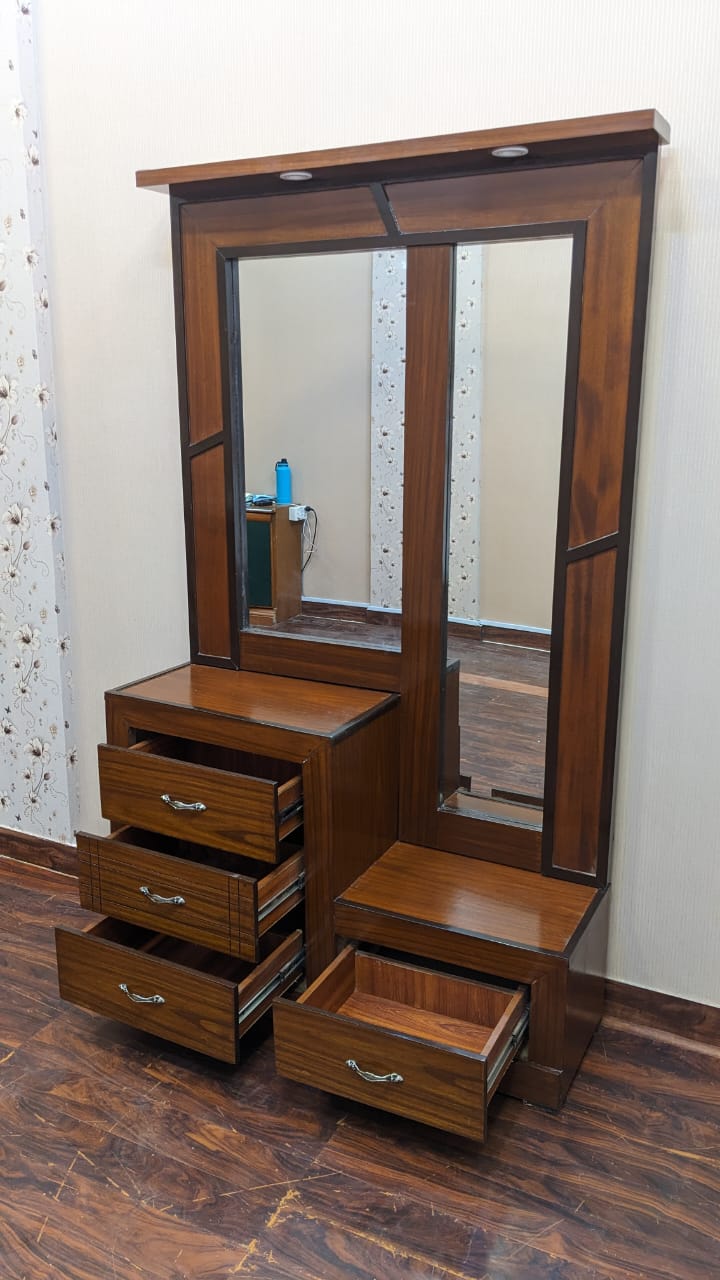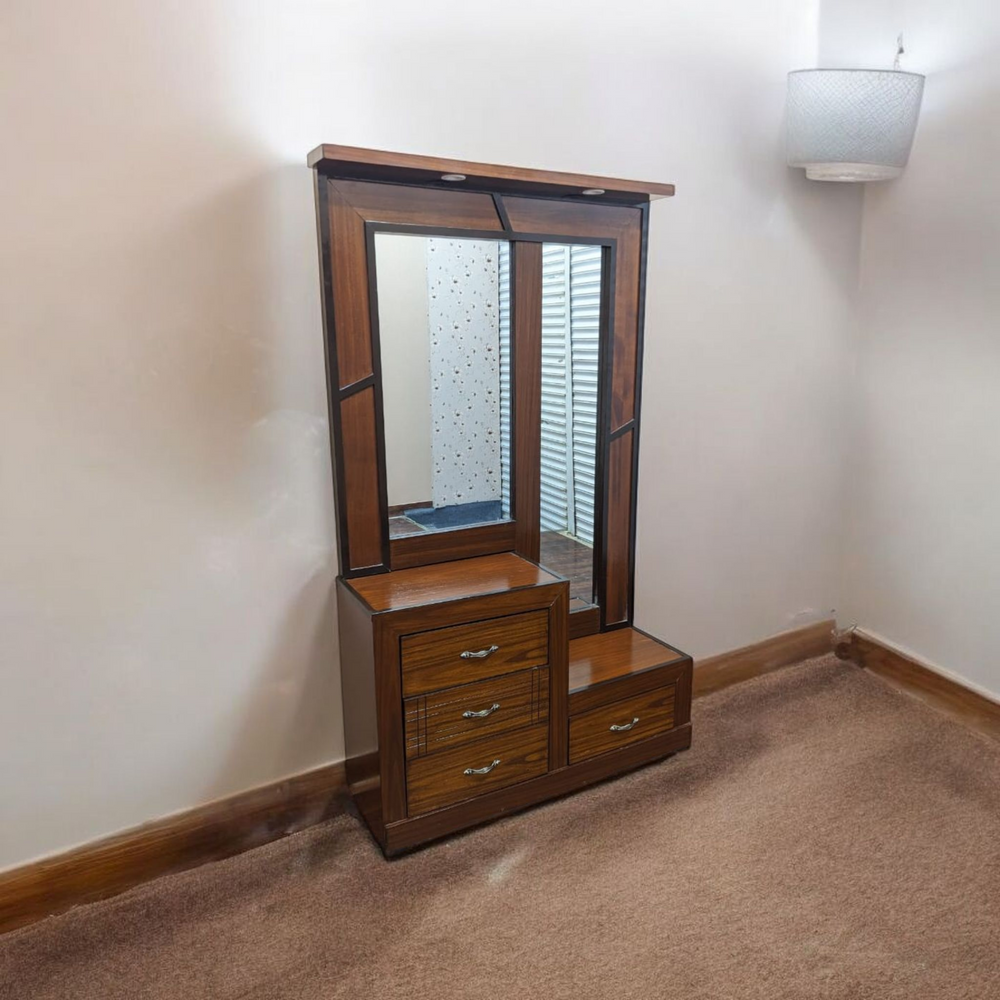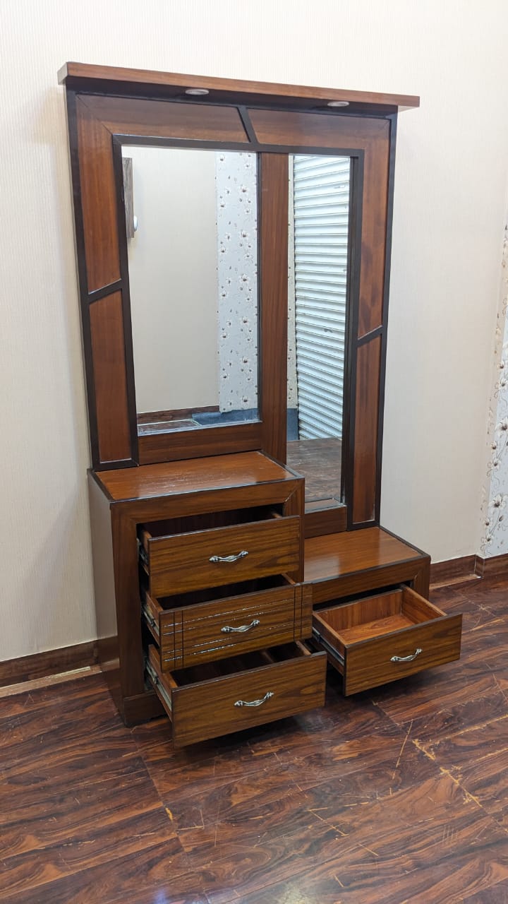 Transform your bedroom with this elegant King Size Bed Set, crafted in rich wood tones with classic panel detailing. The set includes a matching dressing table with mirror and two side tables, each featuring spacious drawers for convenient storage.