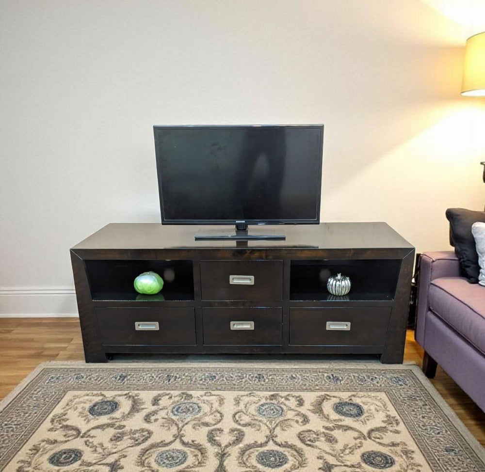 Add style and function to your living space with this elegant LED/media console in a rich dark finish.