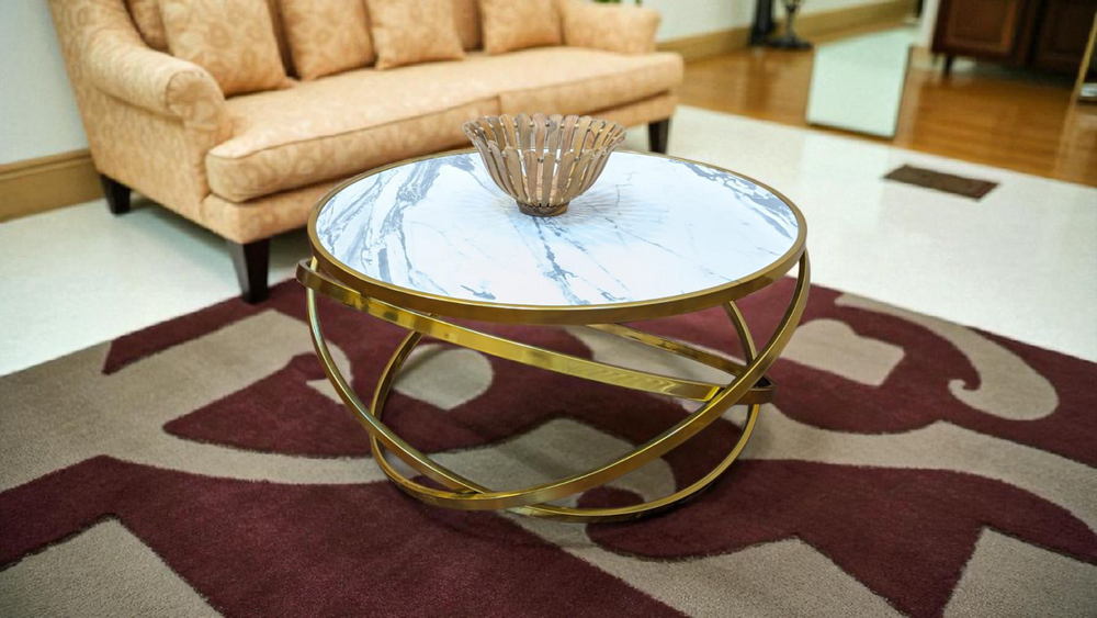 Design: Contemporary round table with elegant marble-look tactile top