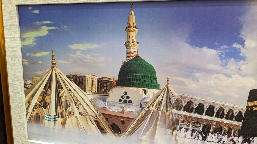 Bring spiritual elegance and timeless beauty to your space with this beautifully crafted wall-mounted vinyl print frame, featuring a breathtaking panoramic view of Masjid-e-Nabawi ﷺ and Khana-e-Kaaba.