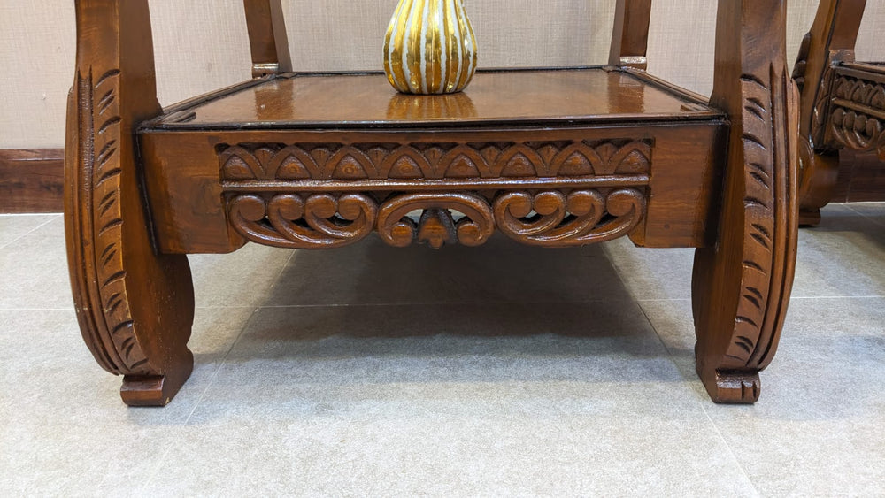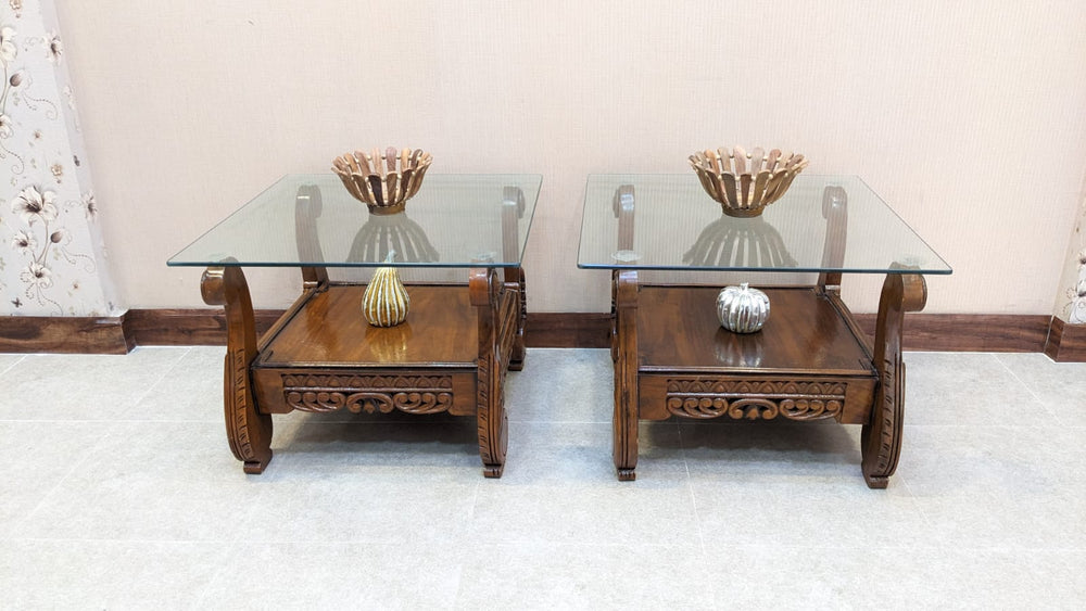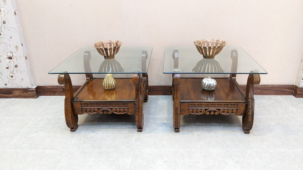 Beautifully crafted corner tables made in premium Sheesham wood, featuring an 8mm thick glass top and intricate hand-carved detailing.
