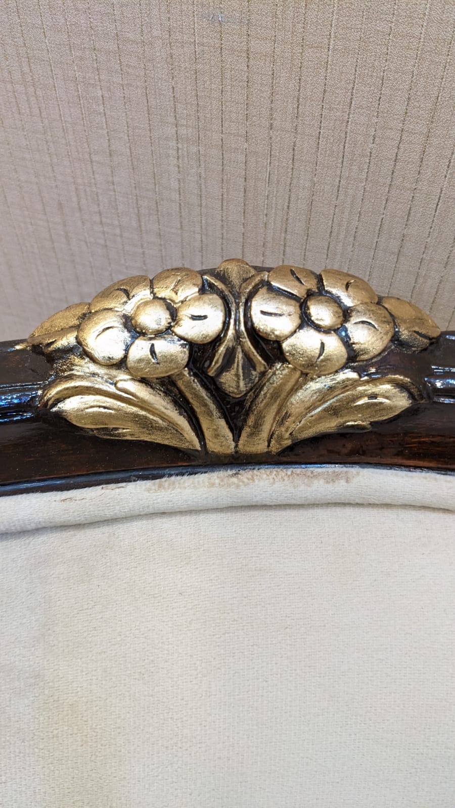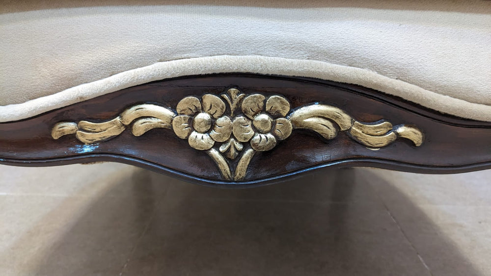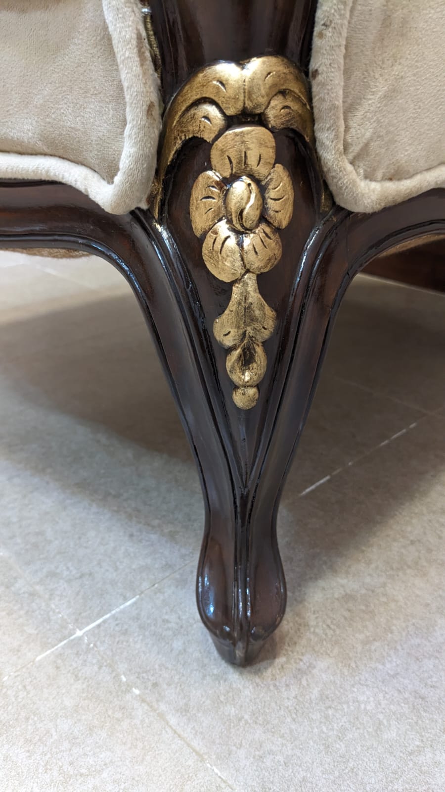 A beautifully crafted pair of classic single seater sofas featuring carved Sheesham wood frame with gold accents.