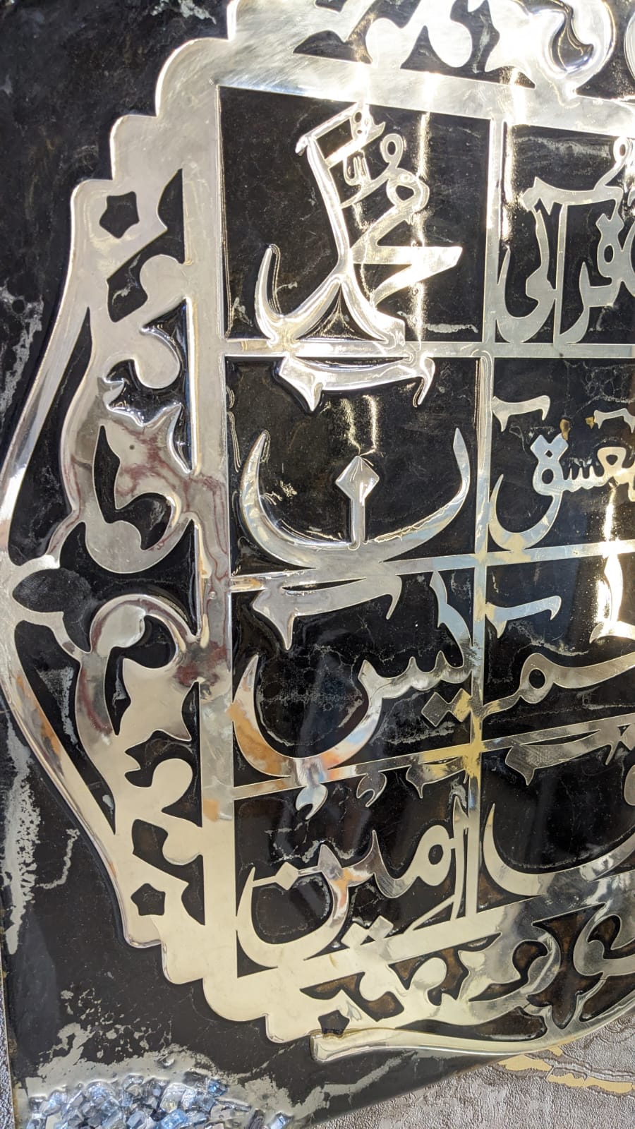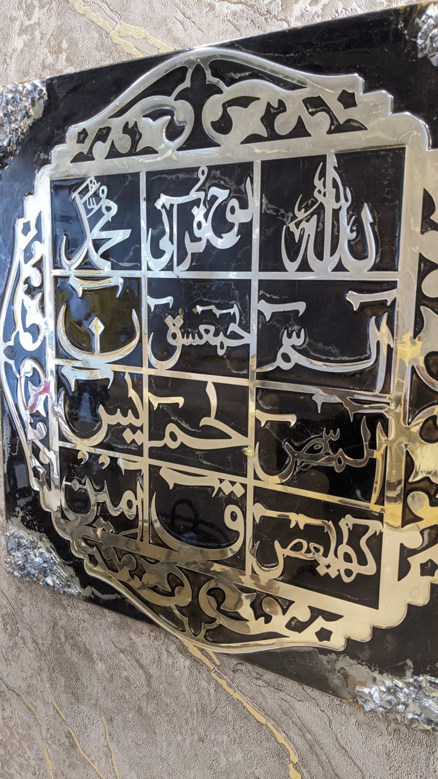 Elegant wall-mounted resin artwork featuring Loh-e-Qurani words, crafted on a deep black base with reflective metallic detailing. The composition is enhanced with subtle textured accents on the corners, giving it a refined and contemporary presence.