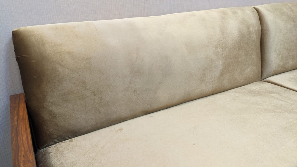 Freshly upholstered in soft velvet fabric, giving it a rich, smooth look.