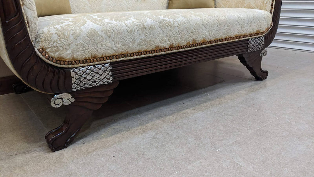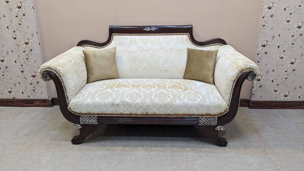 A beautifully crafted vintage-style divan made in premium Solid Sheesham Wood, featuring elegant carved details and a luxurious velvet jacquard upholstery.