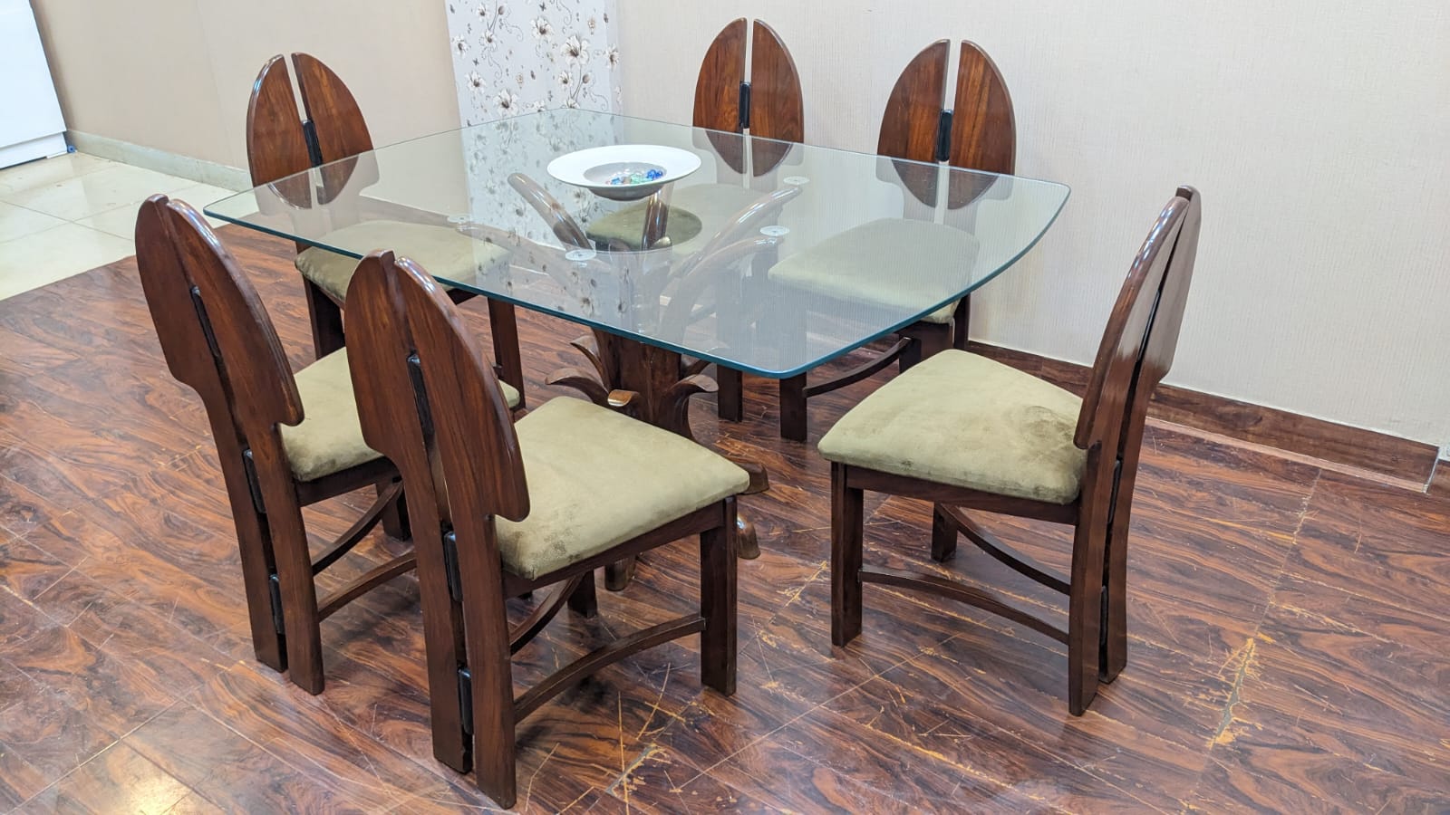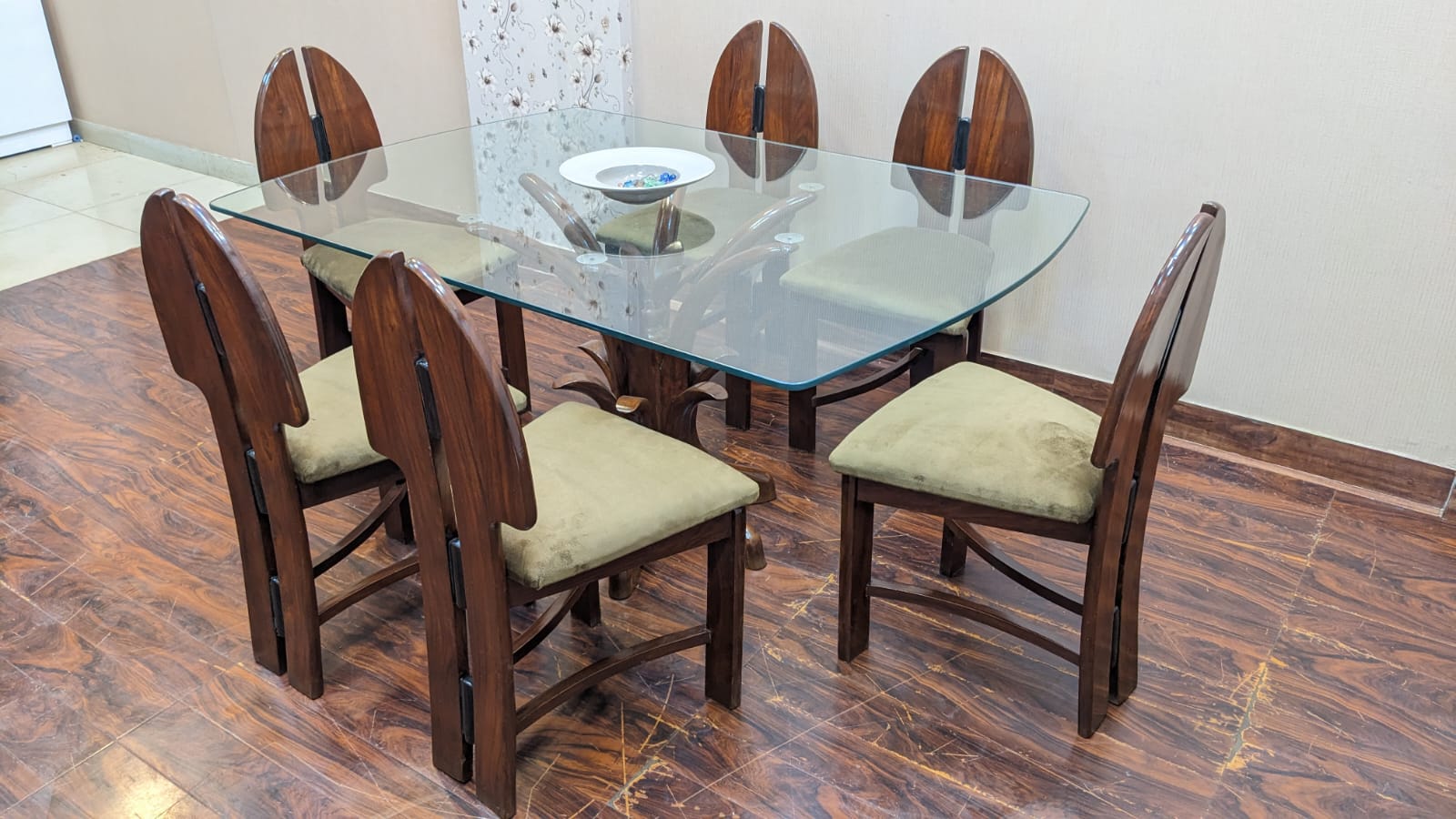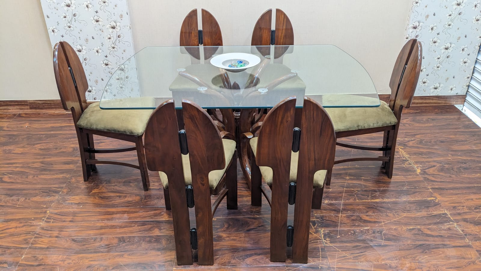 Crafted from 100% solid Sheesham wood, this elegant dining set brings a perfect balance of strength and sophistication to your space. The 12mm glass top rests on a beautifully curved Sheesham base, paired with 6 uniquely designed chairs featuring plush velvet fabric cushions for added comfort and luxury.