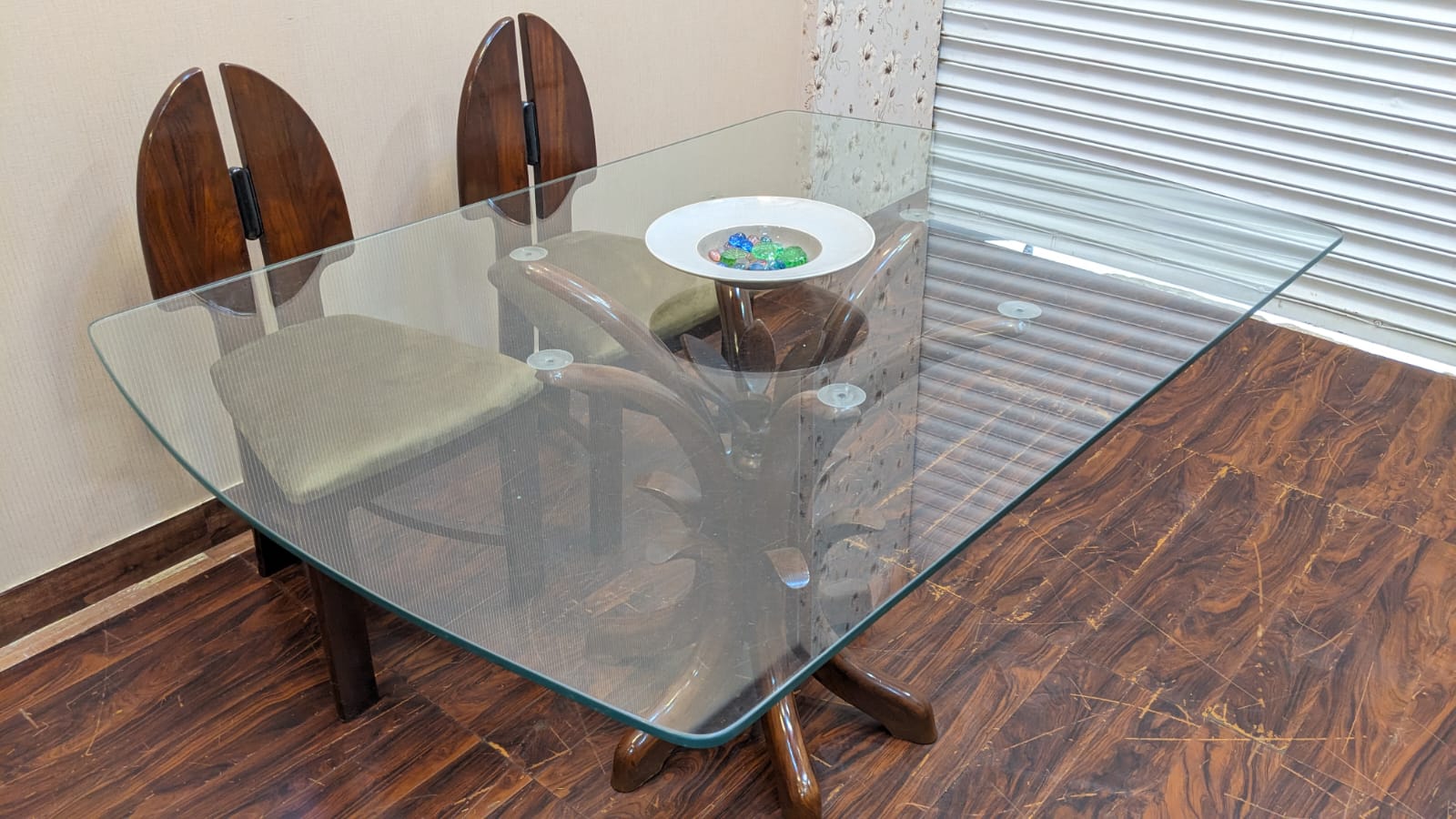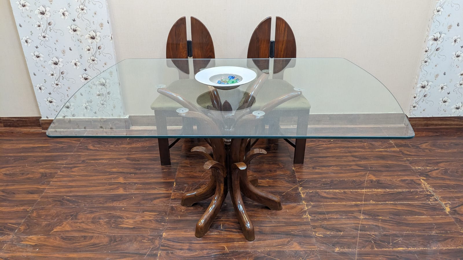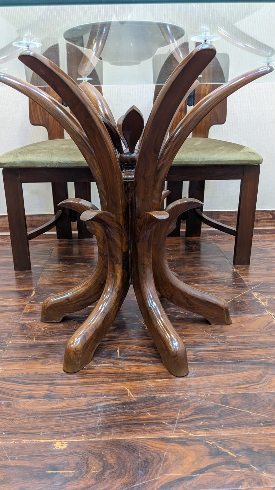 Crafted from 100% solid Sheesham wood, this elegant dining set brings a perfect balance of strength and sophistication to your space. The 12mm glass top rests on a beautifully curved Sheesham base, paired with 6 uniquely designed chairs featuring plush velvet fabric cushions for added comfort and luxury.