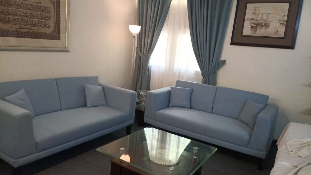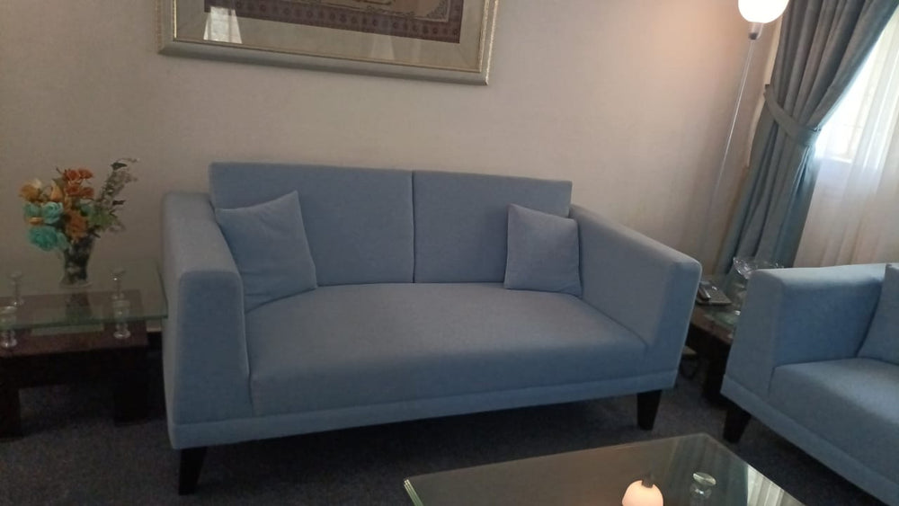 5 seater is a gorgeous light blue sofa set in premium Canvas Fabric is a extremely formal and perfect for any living room. Its smart and comfortable upholstery makes it look versatile & trendy.
