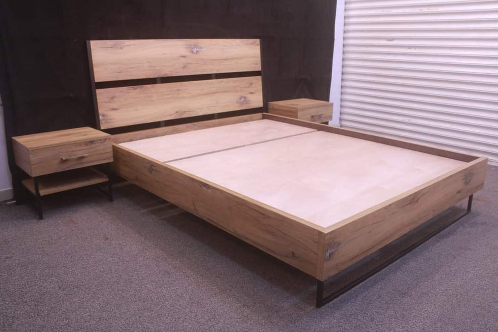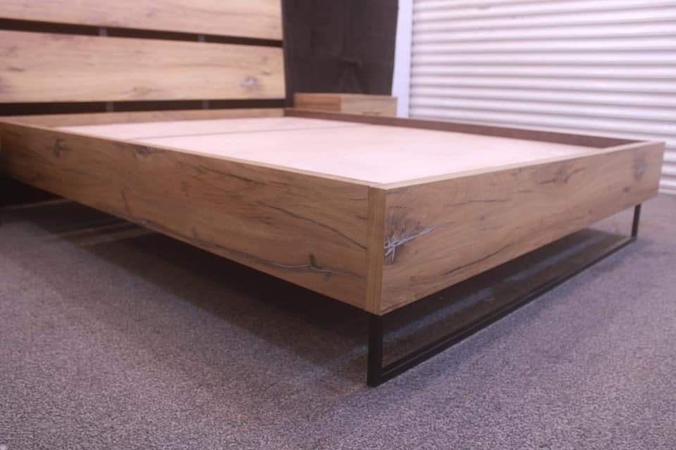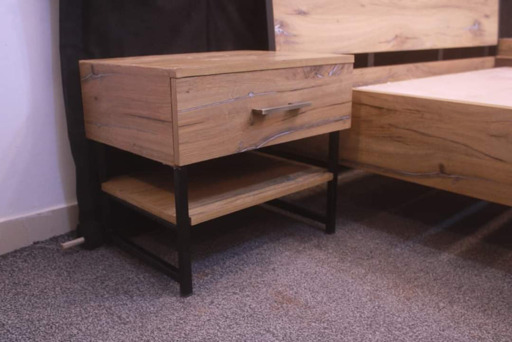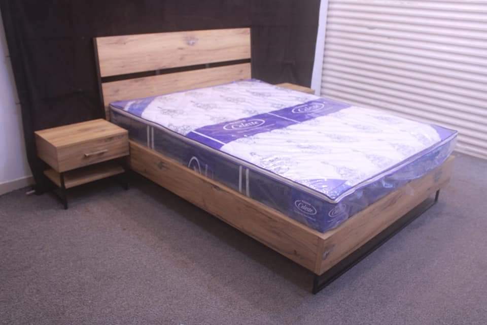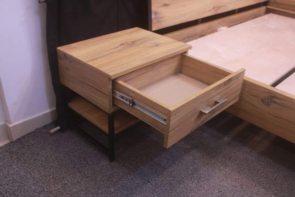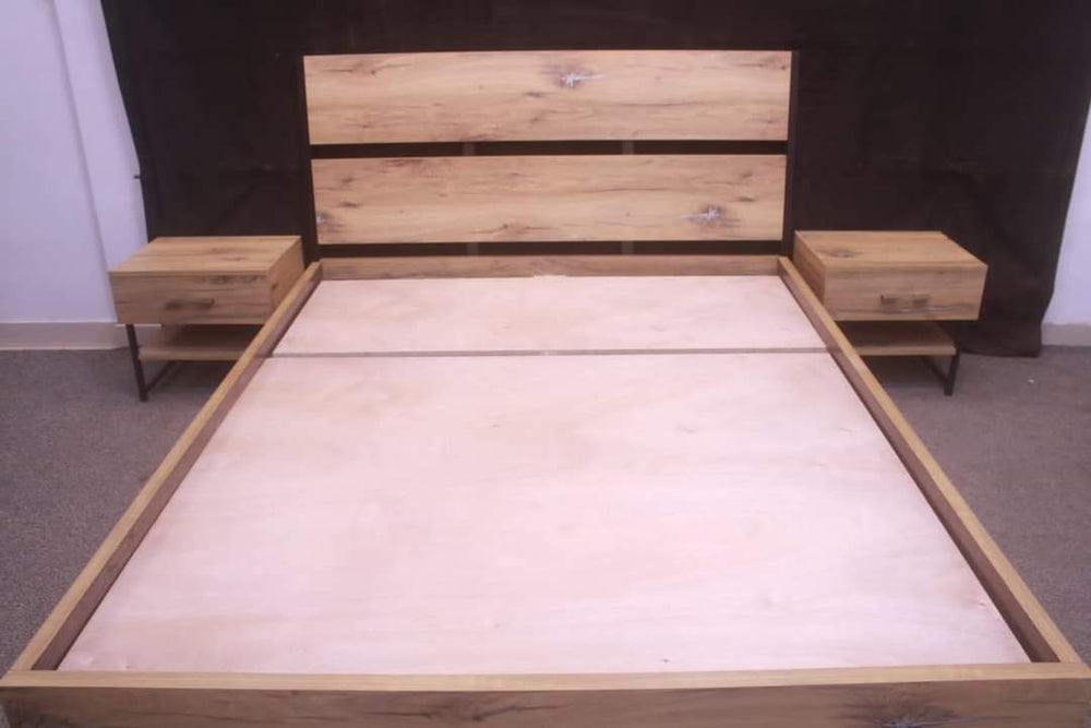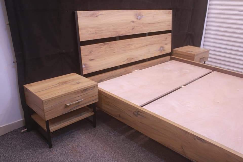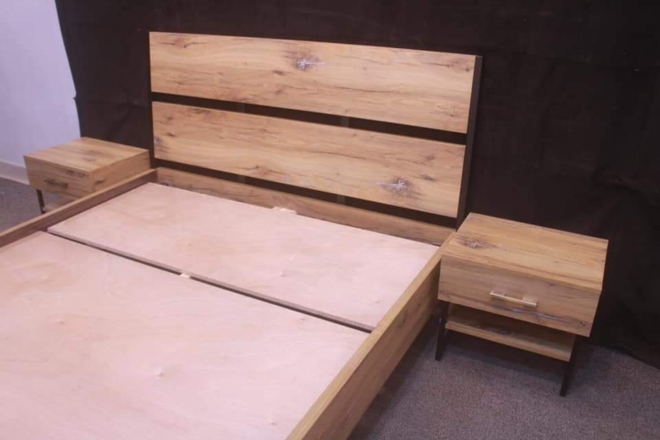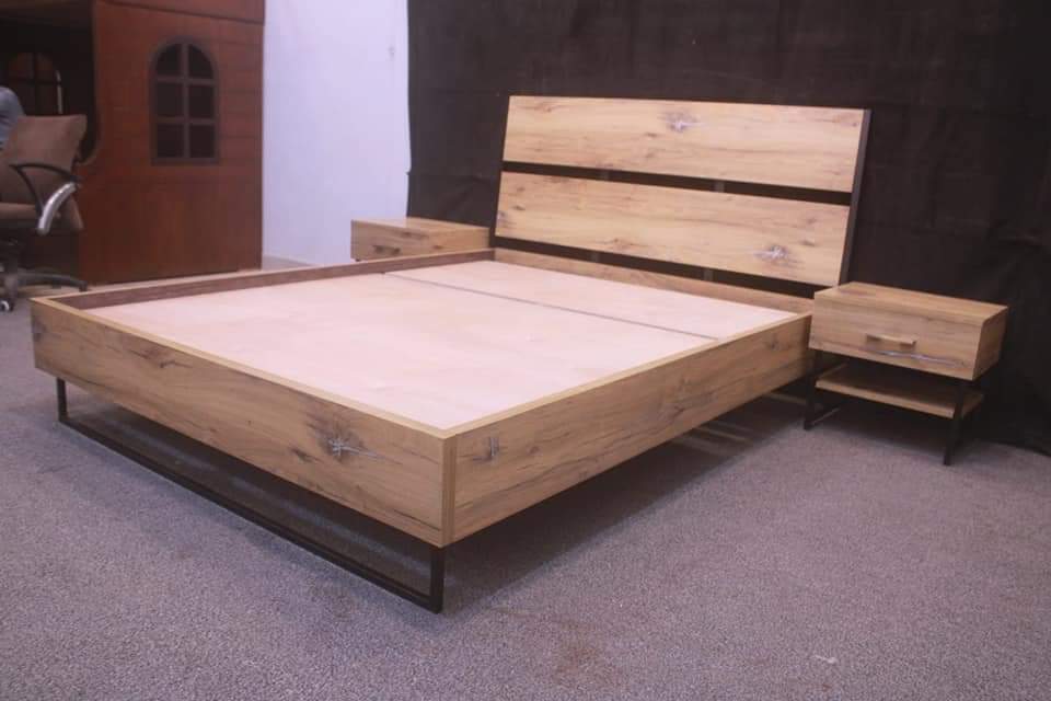 A Modern & Unique Design Queen Size Bed with 2 Smart Side Tables with Combination of Premium Quality Metal Frame & Al-Noor Tactile Lasani Sheet Figures Look Like Wooden Grains.