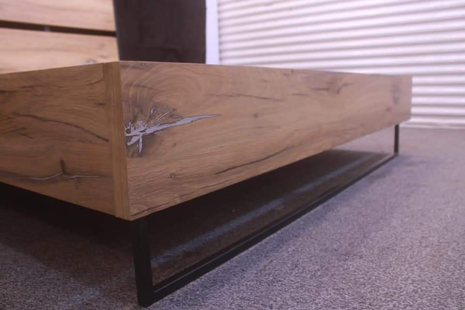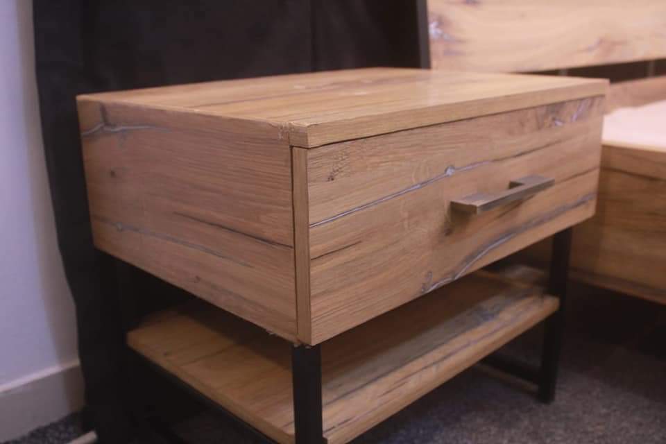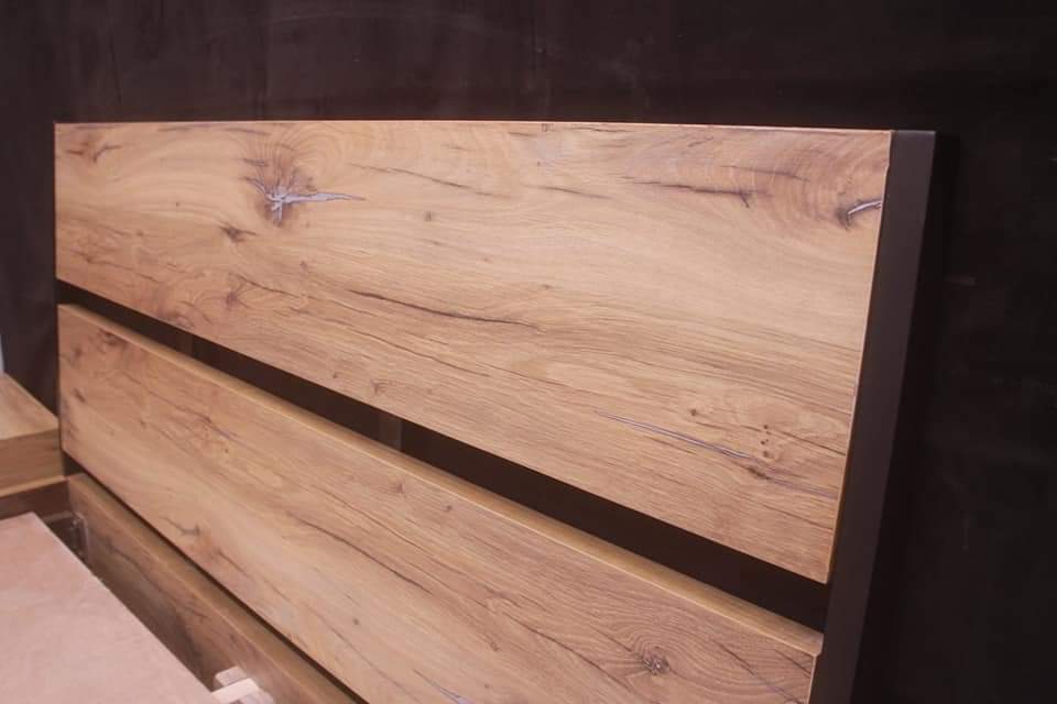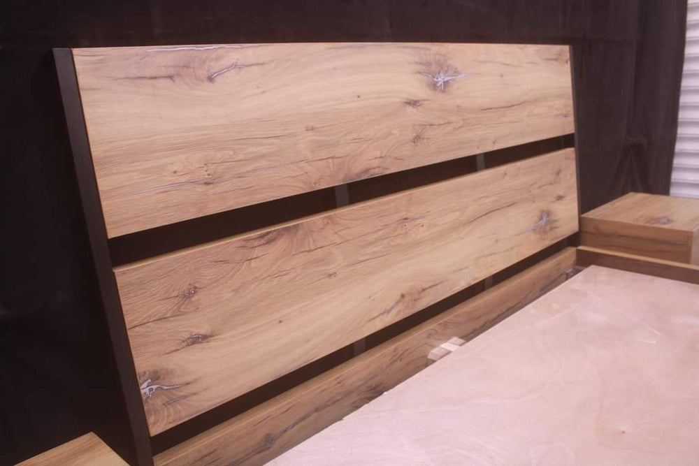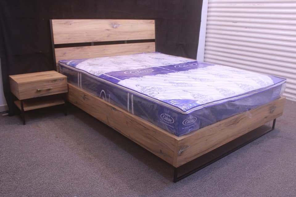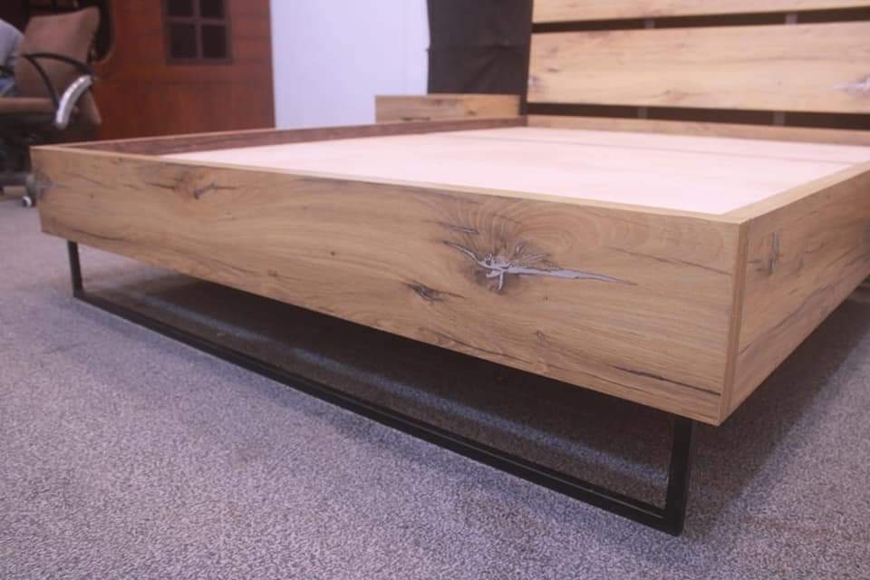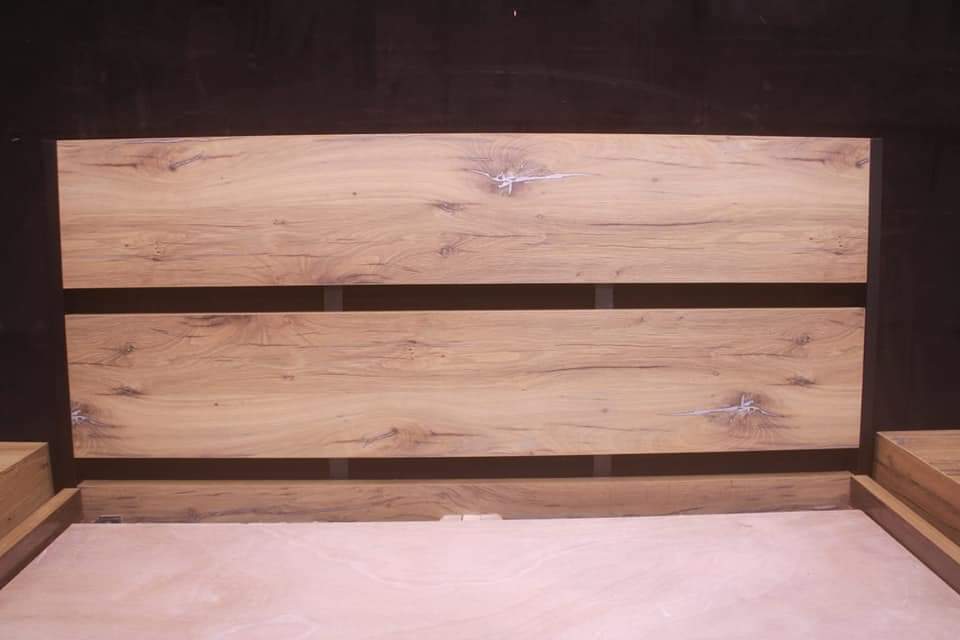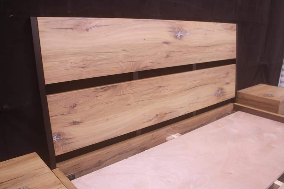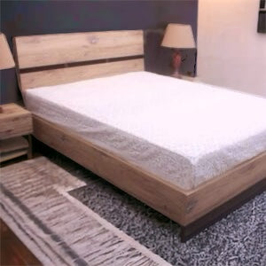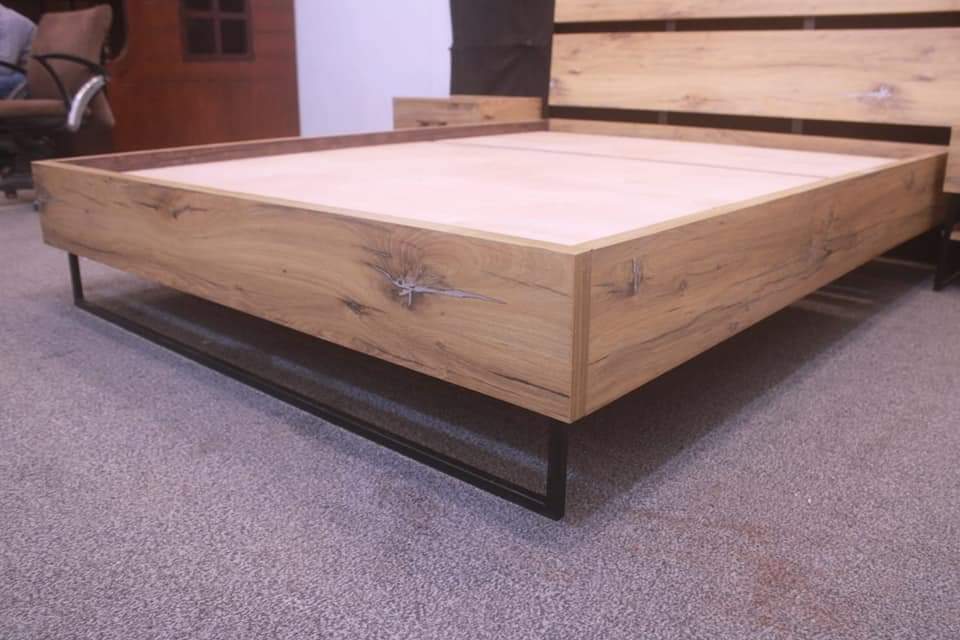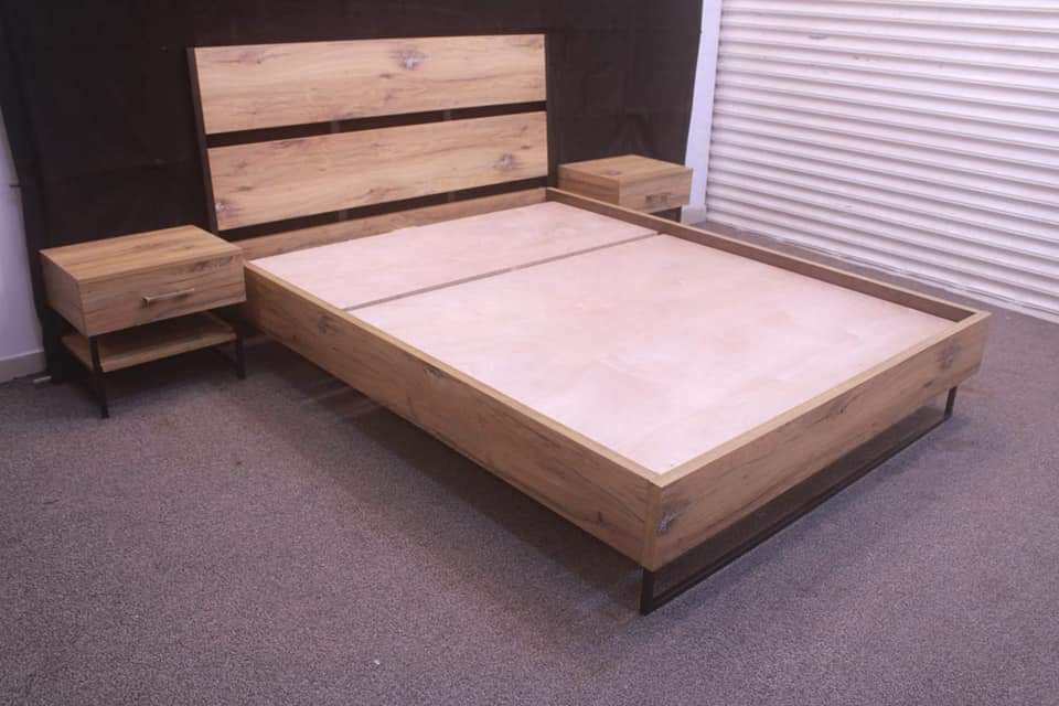 A Modern & Unique Design Queen Size Bed with 2 Smart Side Tables with Combination of Premium Quality Metal Frame & Al-Noor Tactile Lasani Sheet Figures Look Like Wooden Grains.